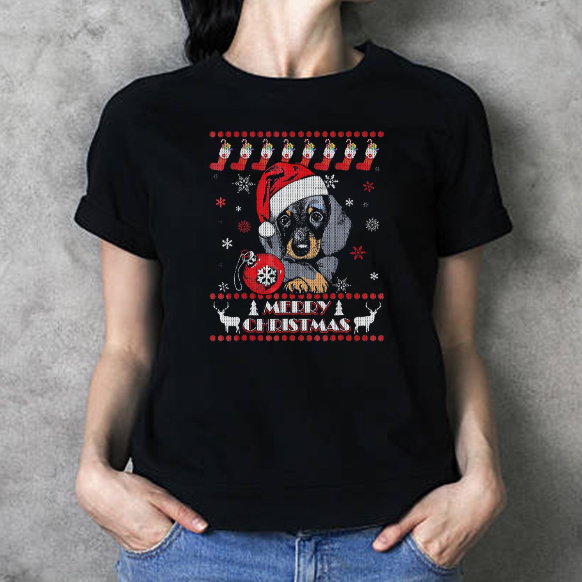 Be the first to review “Merry Christmas Dachshund Ugly Sweater With Santa Hat And Stockings T Shirt”