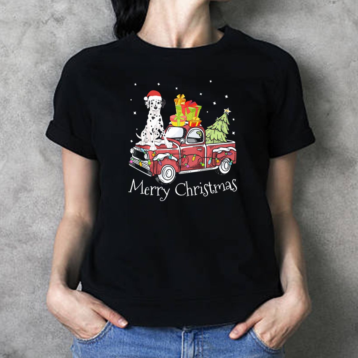 Celebrate the festive spirit with our Merry Christmas Dalmatian Dog on Pickup Truck T-Shirt! This whimsical design features an adorable Dalmatian riding in a classic pickup, surrounded by presents and a Christmas tree, making it the perfect holiday apparel for dog lovers and festive enthusiasts alike. Ideal for casual wear, themed events, or simply spreading holiday cheer, this shirt is a must-have for your winter wardrobe. Plus, it’s fan-made and proudly printed in the USA, ensuring a unique design that stands out!