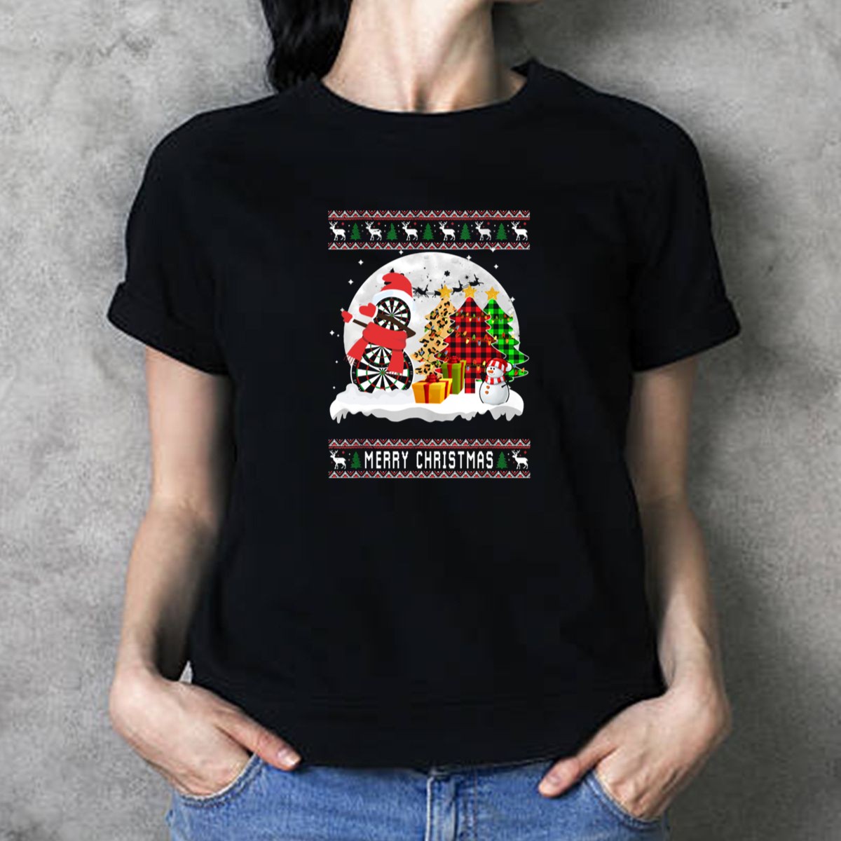 Celebrate the festive season with our Merry Christmas Darts Snowman Plaid Trees And Reindeer Border T-Shirt! Perfect for dart enthusiasts and holiday lovers alike, this fun and vibrant shirt is designed for casual wear during family gatherings, themed events, or simply lounging at home. Made with a fan-made design printed in the USA, it combines comfort and style, making it a unique addition to your holiday wardrobe.