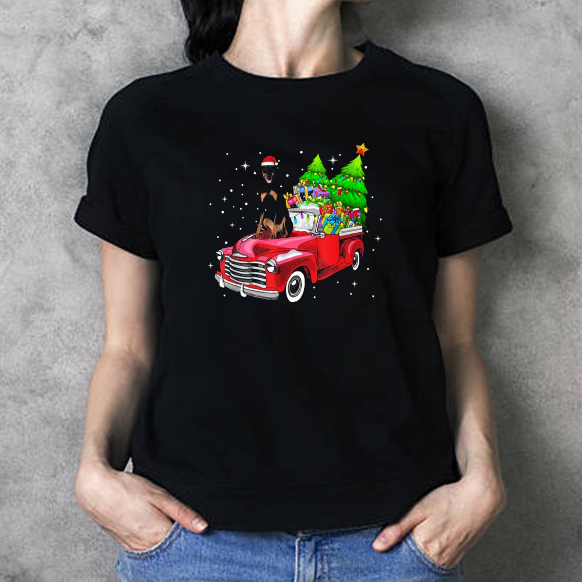 Merry Christmas Doberman Pinscher Santa Hat Red Truck Presents Tree T-Shirt