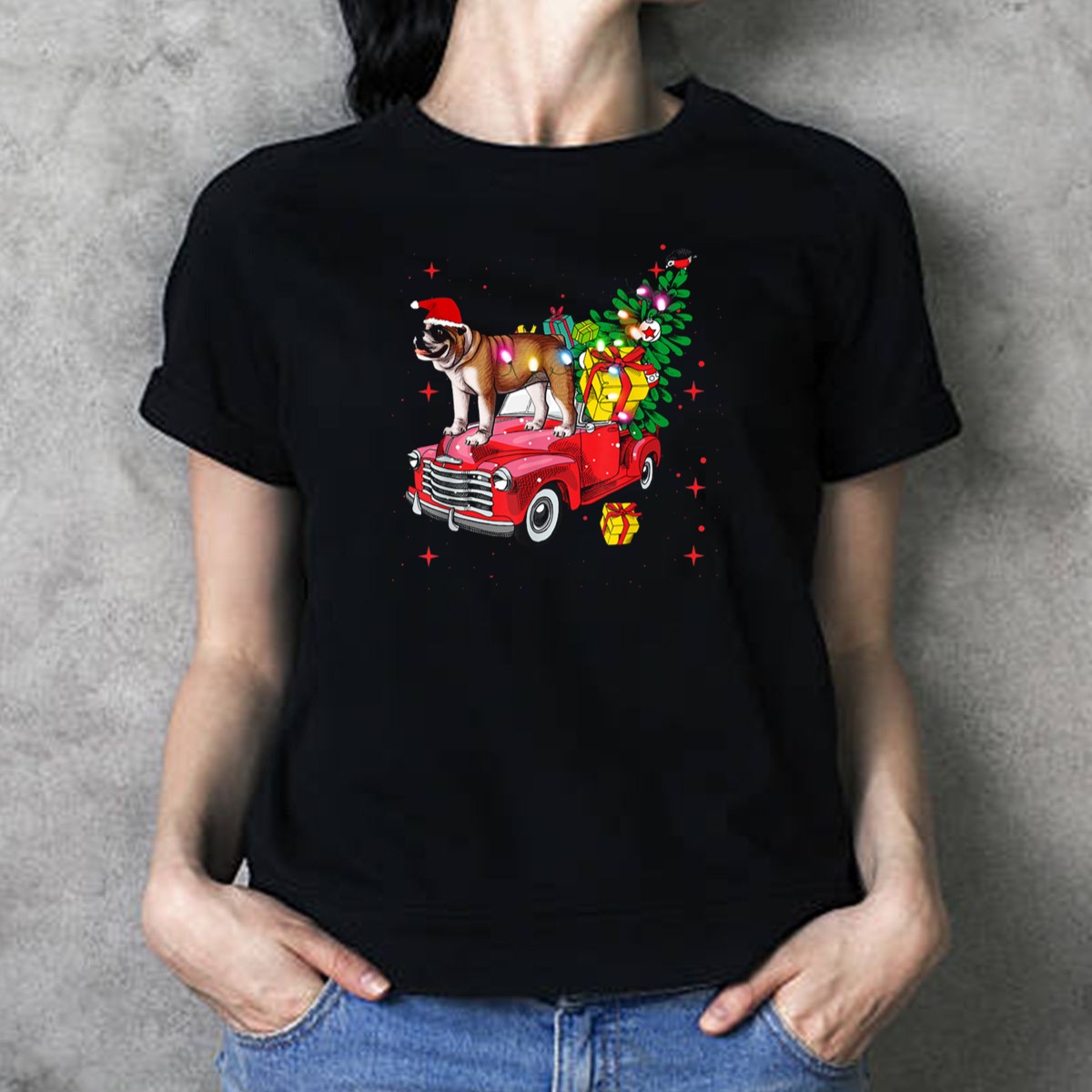 Celebrate the festive season with our Merry Christmas English Bulldog on Red Truck T-Shirt! Perfect for dog lovers and holiday enthusiasts alike, this fun and unique design features an adorable English Bulldog donning a Santa hat, surrounded by gifts, all set against a vibrant red truck backdrop. Ideal for casual wear, themed events, or simply spreading holiday cheer, this t-shirt will surely become a favorite during all your seasonal festivities.