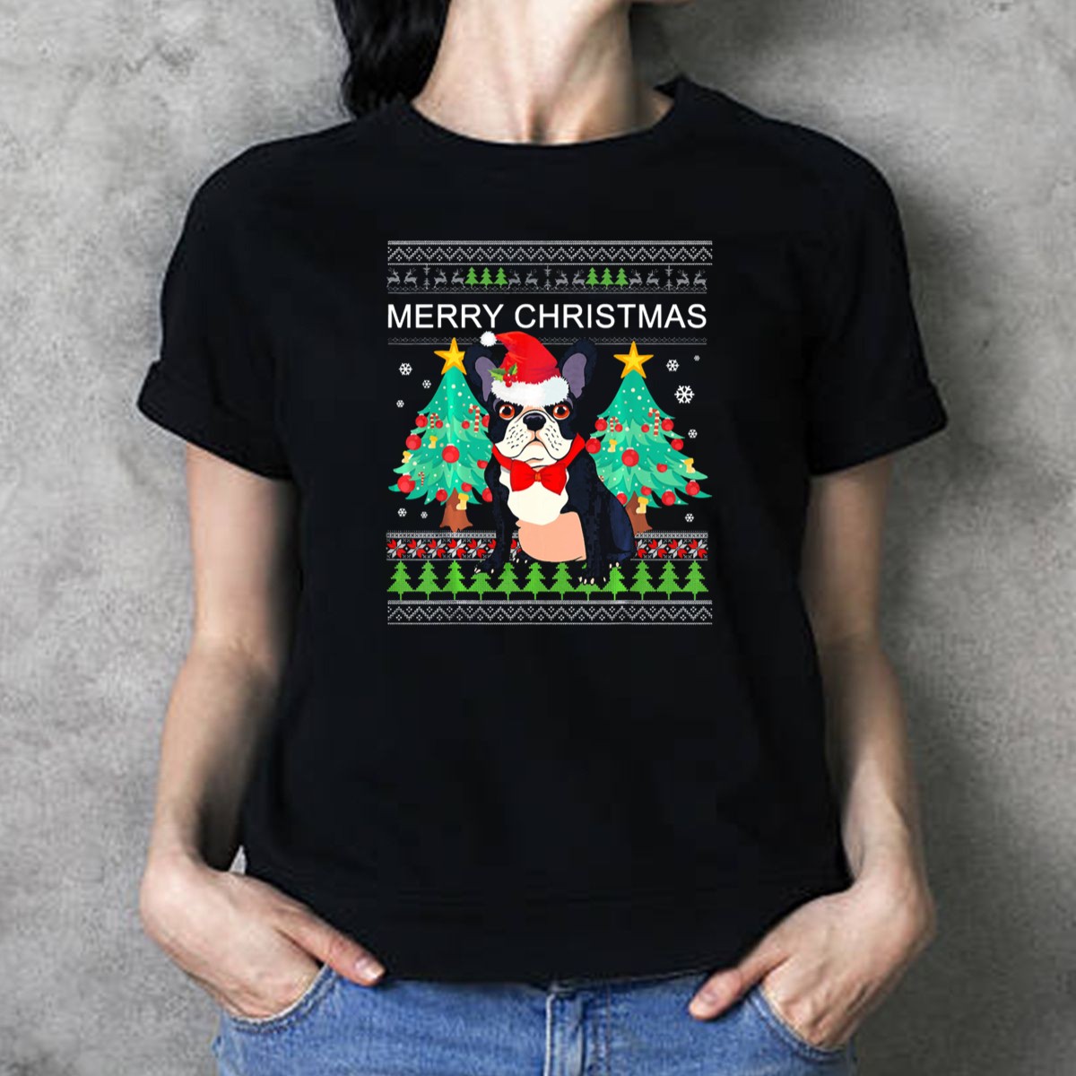Celebrate the festive season with our Merry Christmas French Bulldog Funny Ugly Sweater T-Shirt! Perfect for dog lovers and anyone who enjoys a good laugh, this T-shirt features a whimsical design that showcases a charming French Bulldog adorned with a Santa hat and bow tie, surrounded by Christmas trees. Ideal for casual outings, themed events, or just lounging around during the holidays, this shirt adds a touch of humor to your holiday wardrobe while keeping you comfortable and stylish.