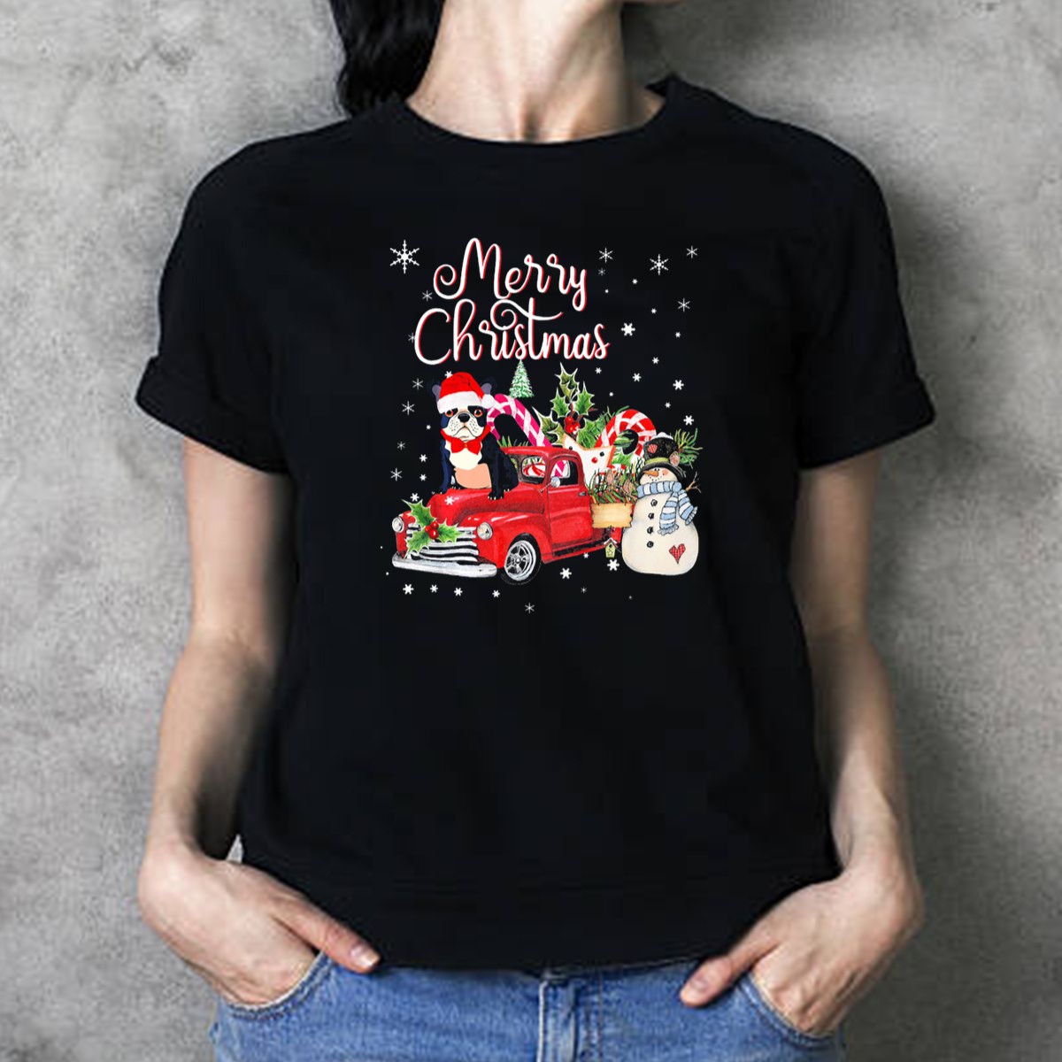 Get ready to spread holiday cheer with our Merry Christmas French Bulldog Santa Riding Red Truck T-Shirt! This fun and festive design features an adorable French Bulldog dressed as Santa, cruising in a classic red truck alongside a cheerful snowman and sweet candy canes. Perfect for dog lovers and holiday enthusiasts alike, this shirt is ideal for casual wear, themed events, or just celebrating the joy of the season. Made with care in the USA, it combines comfort and style for a unique festive look!