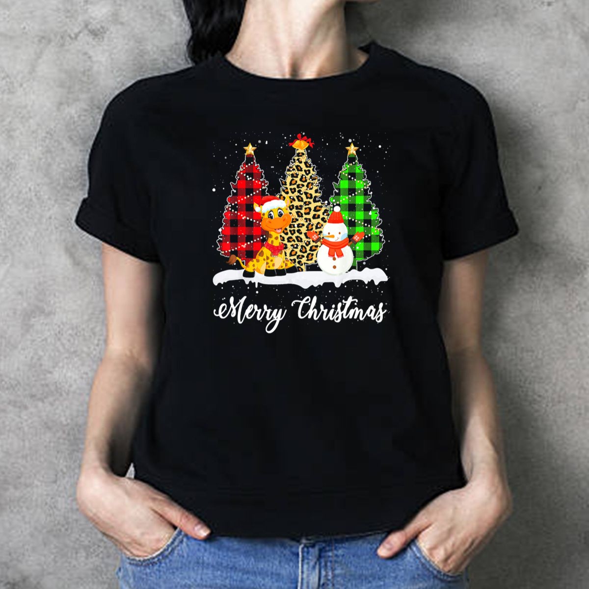 Merry Christmas Funny Giraffe Leopard Buffalo Plaid Trees T-Shirt