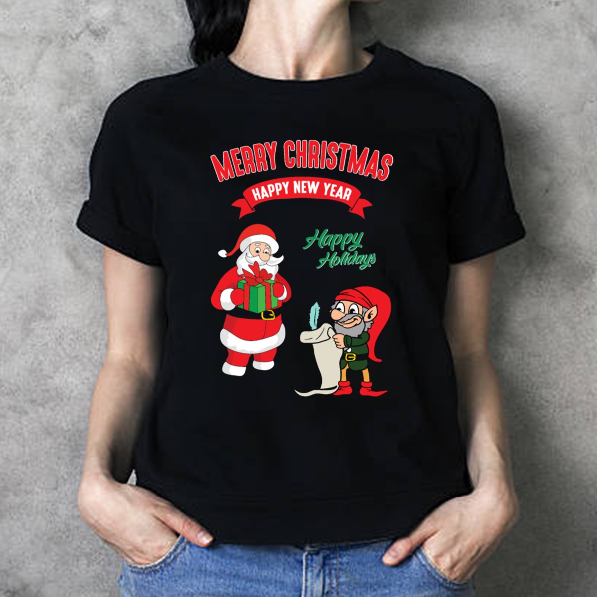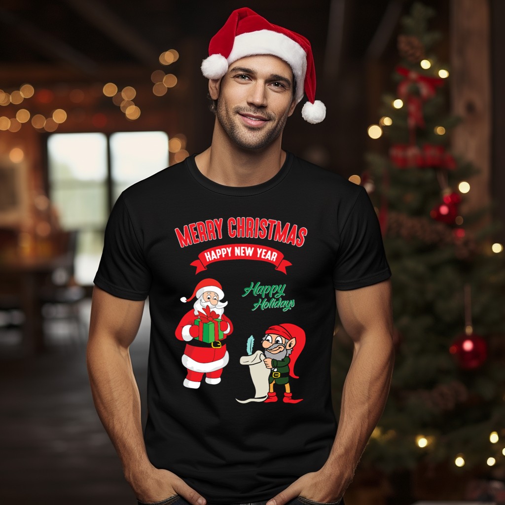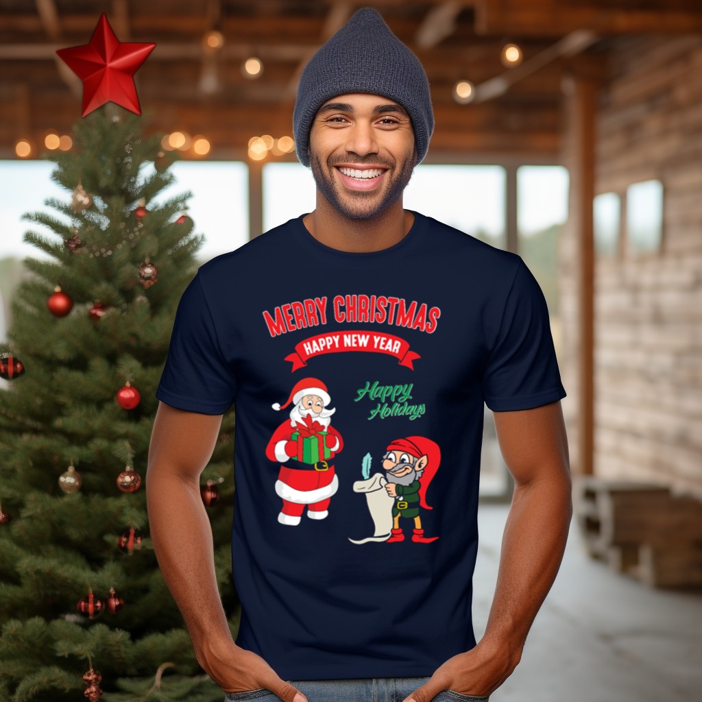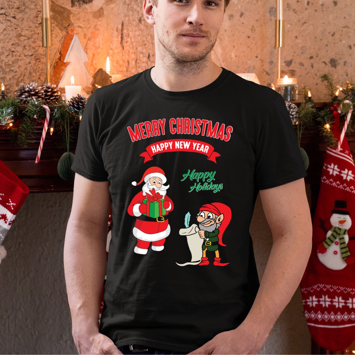 Celebrate the festive season with our Merry Christmas Happy New Year Happy Holidays T-Shirt featuring a delightful print of Santa Claus and an elf! This fun and cheerful shirt is perfect for anyone looking to spread holiday cheer at casual gatherings, themed events, or simply during daily wear. Made for comfort and style, it’s a must-have for the holiday season that will surely bring a smile to your face and those around you.