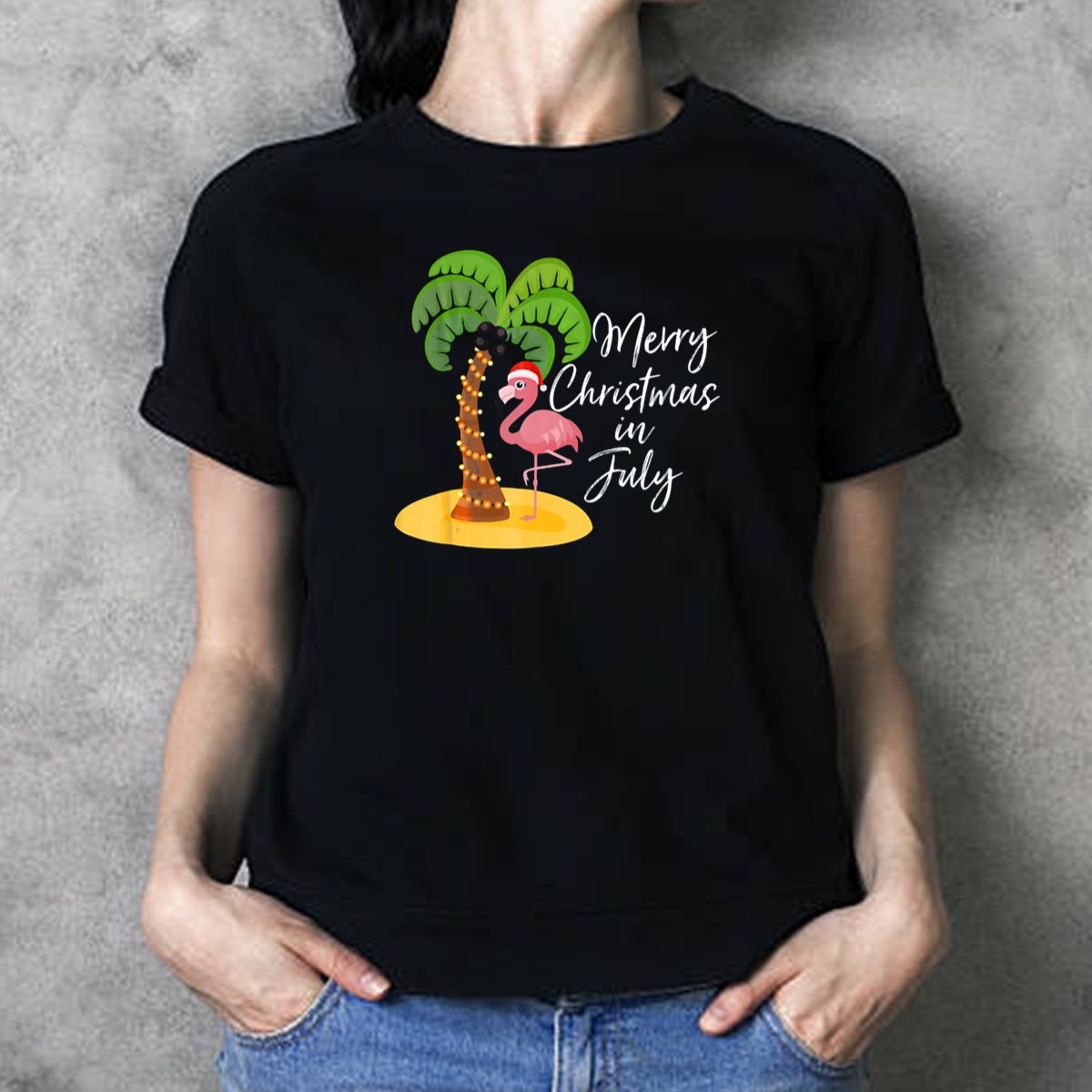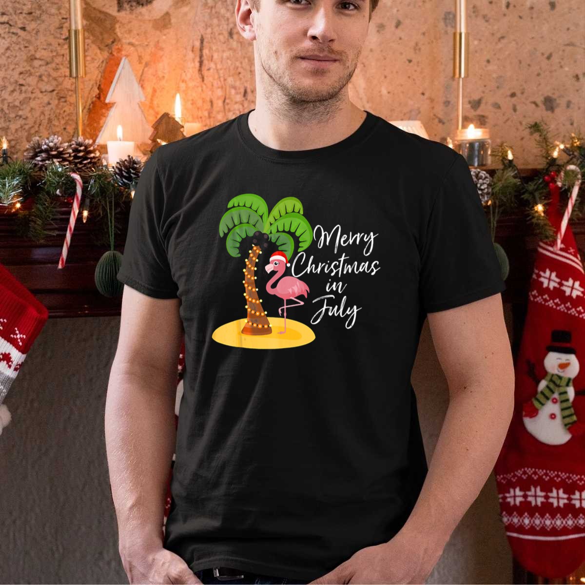 Celebrate the spirit of summer and the joy of the holiday season with our Merry Christmas In July Funny Flamingo With Palm Tree T-Shirt! Perfect for those who love to combine festive cheer with tropical vibes, this shirt is ideal for casual outings, themed events, or simply lounging at home. Made from high-quality materials, it features a unique fan-made design that showcases your love for both Christmas and summer in a fun and playful way!