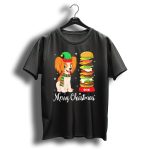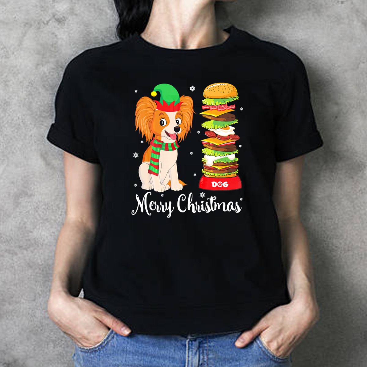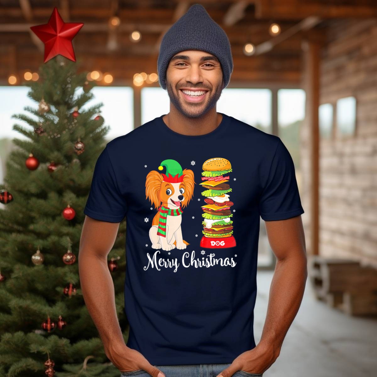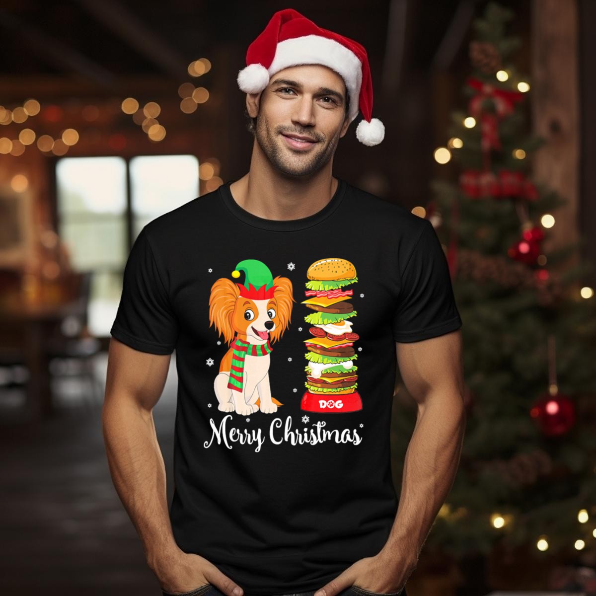 Celebrate the holiday season with our Merry Christmas Papillon In Elf Costume T-shirt! This whimsical design features a playful Papillon dressed as an elf, balancing a tower of delicious hot dogs and burgers, making it the perfect choice for dog lovers and food enthusiasts alike. Ideal for casual outings, themed events, or simply spreading festive cheer during daily wear, this shirt is sure to become a favorite in your holiday wardrobe.