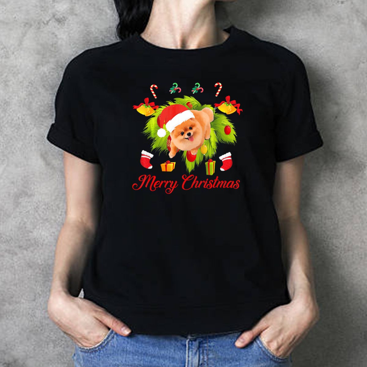 Be the first to review “Merry Christmas Pomeranian Santa Hat Gifts Stockings Candy Canes T Shirt”