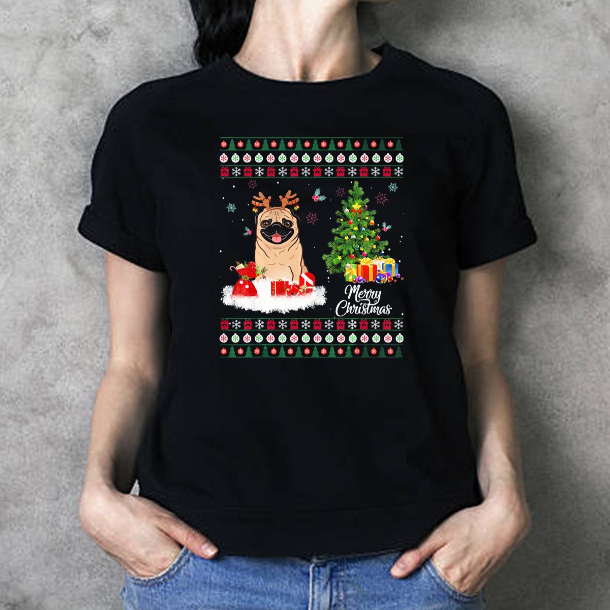 Celebrate the festive spirit with our Merry Christmas Pug Reindeer T-Shirt, perfect for dog lovers and Christmas enthusiasts alike! This charming design features an adorable pug dressed as a reindeer surrounded by presents and a beautifully decorated tree, making it an ideal choice for casual wear, themed events, or just spreading holiday cheer. Crafted for comfort and style, this shirt is a delightful addition to your all-season wardrobe.