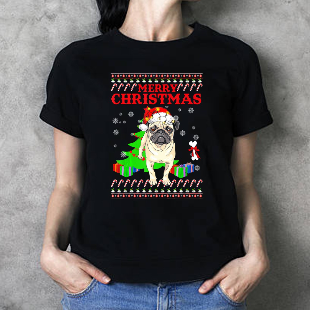 Be the first to review “Merry Christmas Pug Santa Hat Snowflakes Candy Canes Presents T-Shirt”