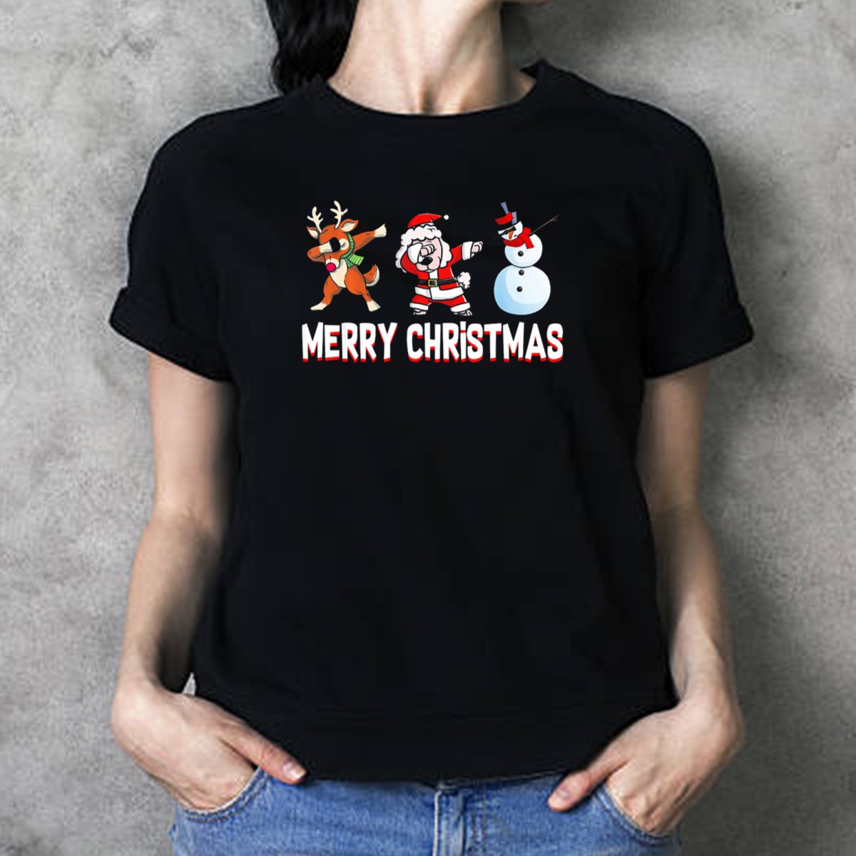 Get into the festive spirit with our Merry Christmas Reindeer Santa Snowman Dab Dance T-Shirt! Perfect for holiday gatherings, themed events, or simply spreading cheer during the season, this fun and playful design is sure to bring smiles to everyone around. Made with love and printed in the USA, this shirt is a must-have for anyone looking to celebrate the joys of Christmas in style.