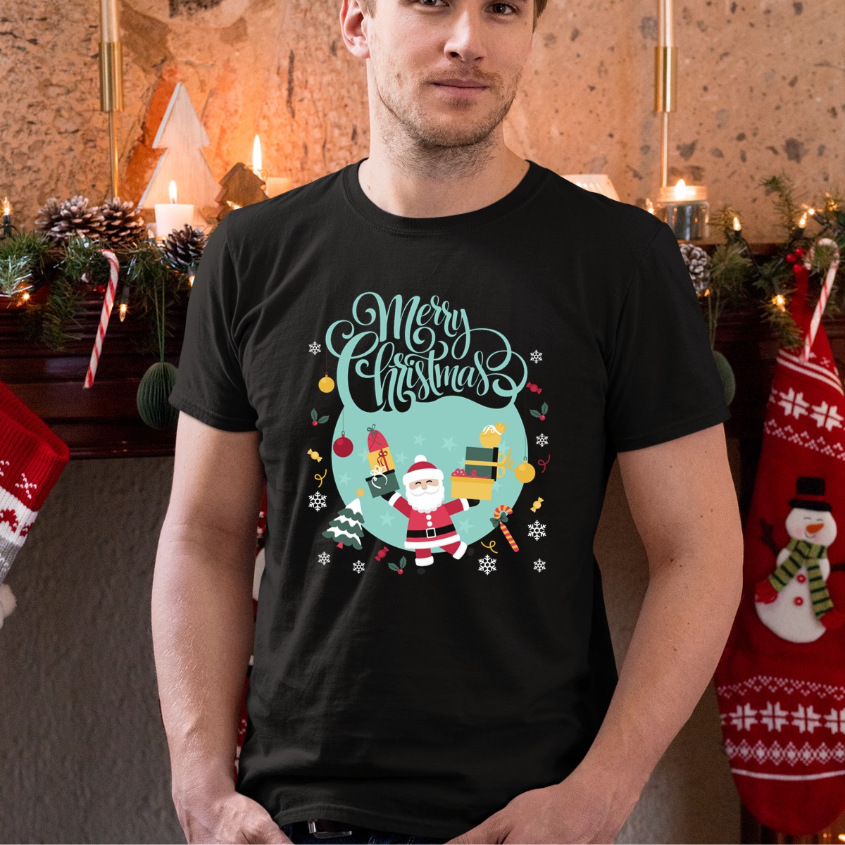 Be the first to review “Merry Christmas Santa Carrying Gifts With Festive Decorations T-Shirt”