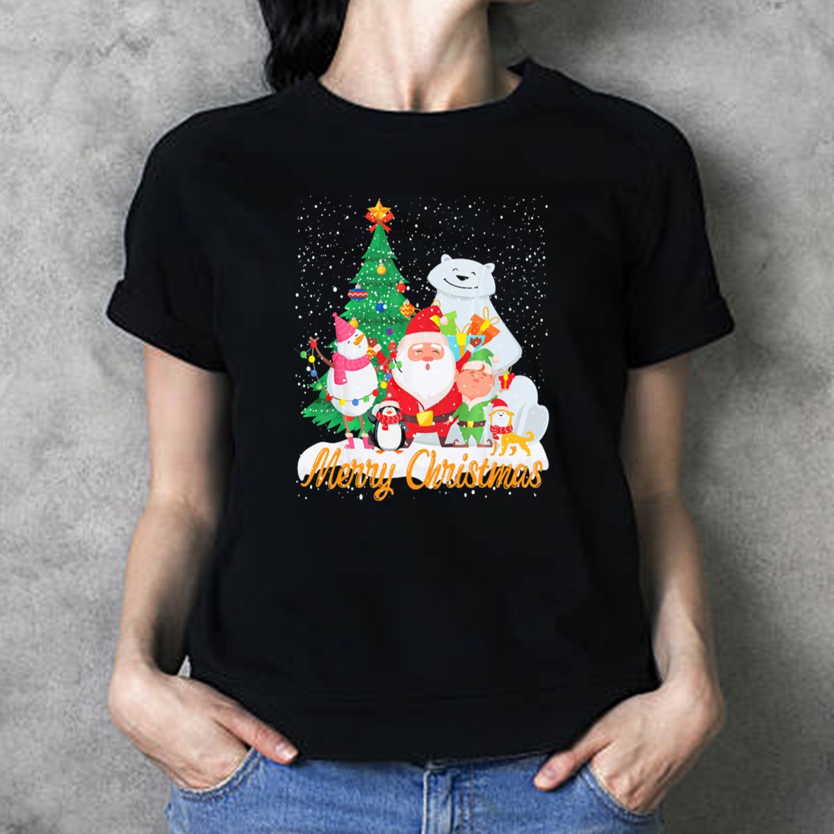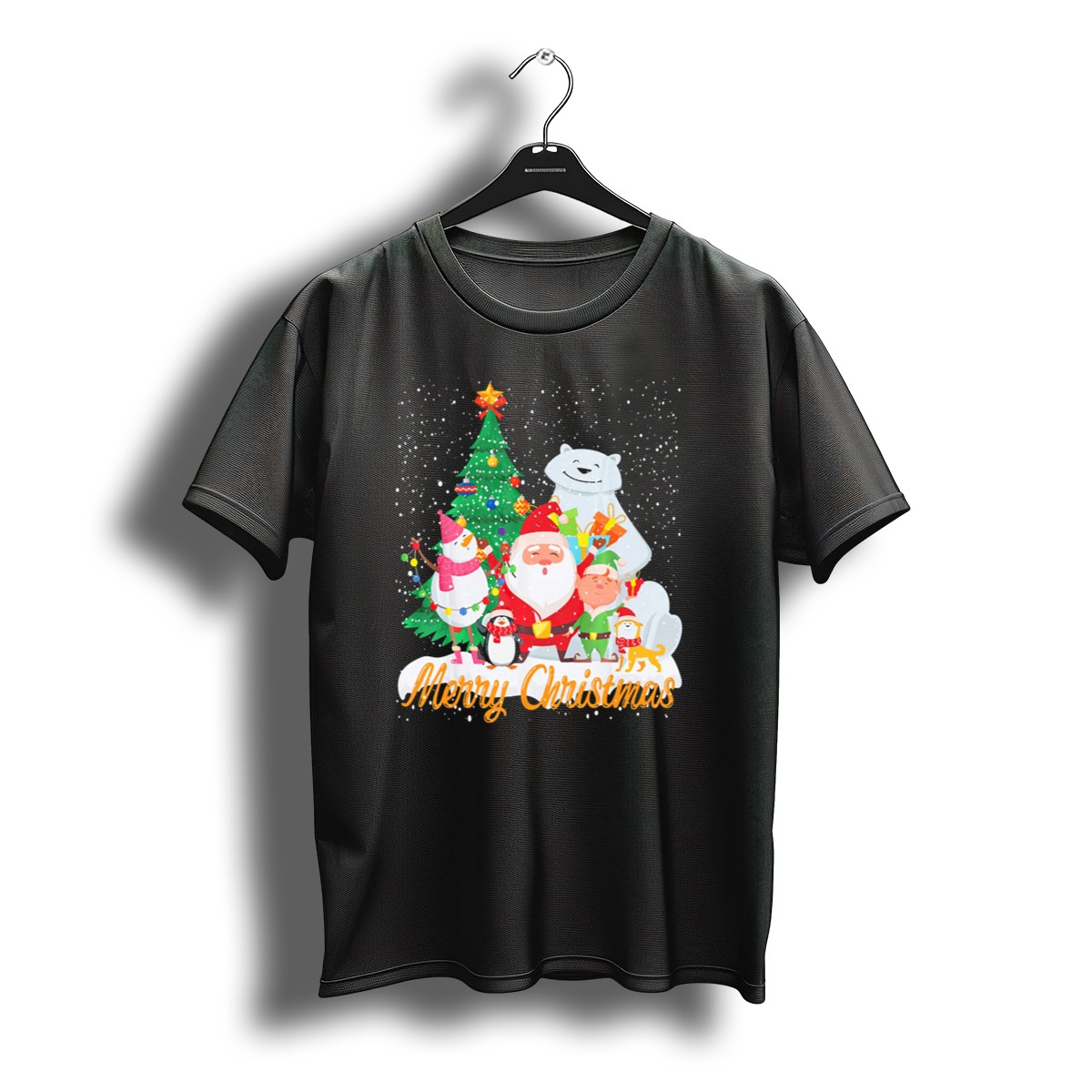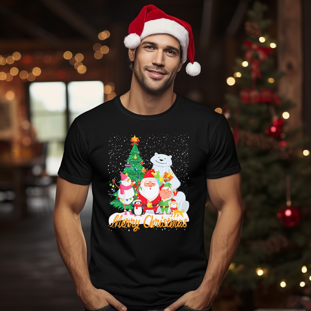 Celebrate the joy of the holiday season with our Merry Christmas T-Shirt, featuring a whimsical design of Santa Claus, a snowman, a penguin, an elf, a tree, and a polar bear all nestled in a winter wonderland. Perfect for families, friends, or anyone looking to spread cheer, this shirt is ideal for casual wear, themed events, or just to bring a smile to your daily routine. Crafted with care and printed in the USA, it brings a unique touch to your festive wardrobe.