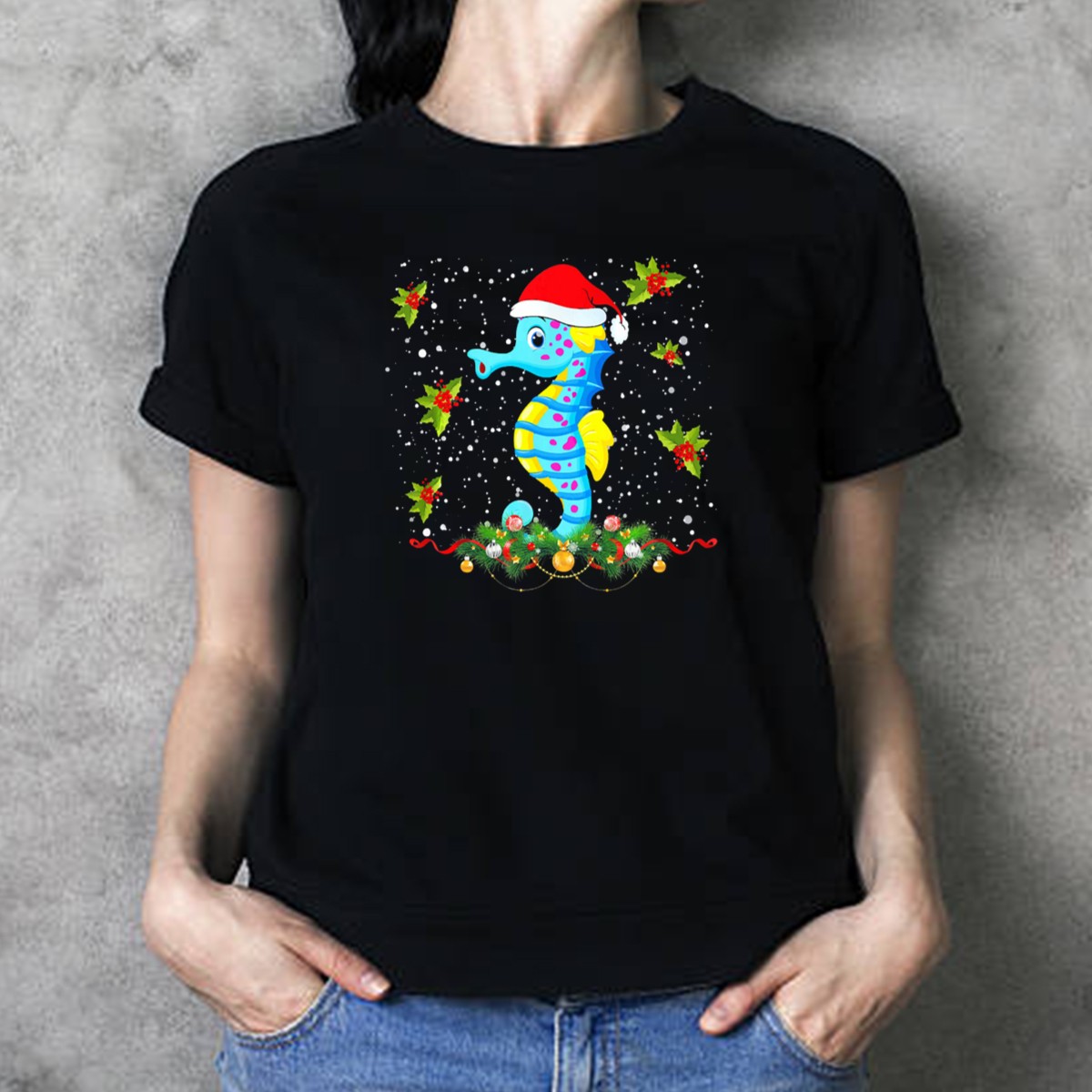 Celebrate the holiday season in style with our Merry Christmas Seahorse Santa Hat Holly Ornaments Snowflakes T-Shirt! Perfect for ocean lovers and holiday enthusiasts alike, this whimsical tee is ideal for casual gatherings, themed events, or simply spreading festive cheer during daily wear. The unique fan-made design, printed right here in the USA, brings a touch of fun and creativity to your Christmas wardrobe.