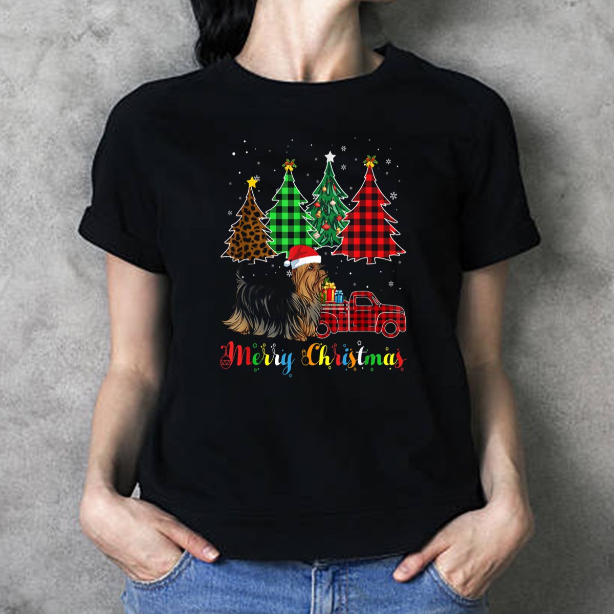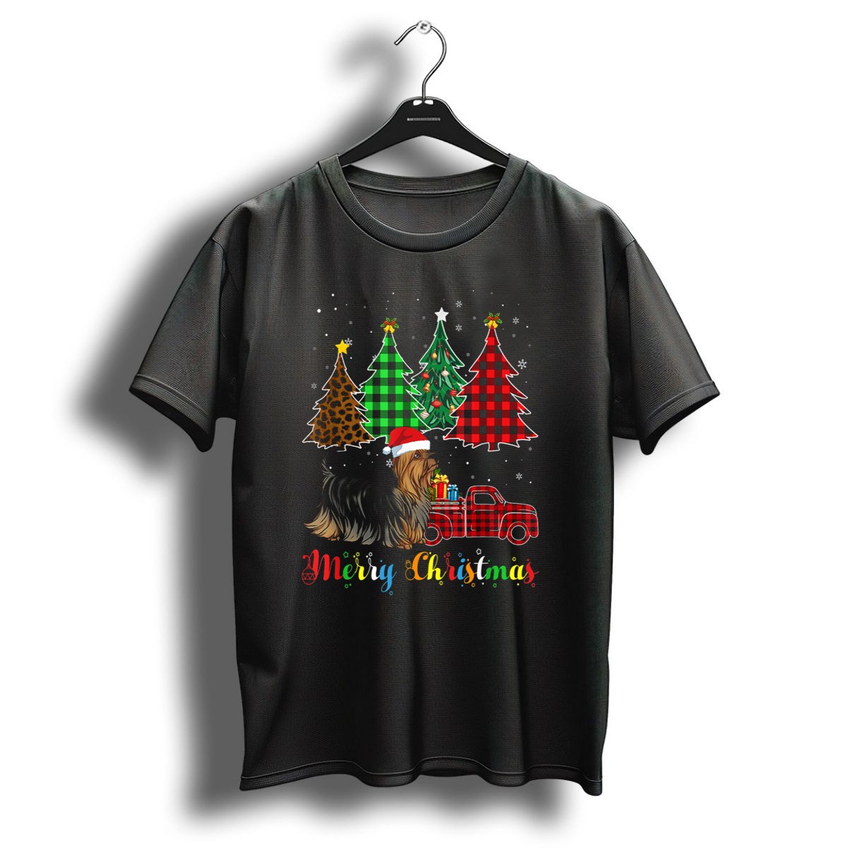 Merry Christmas Silky Terrier With Plaid Trees And Red Truck T Shirt