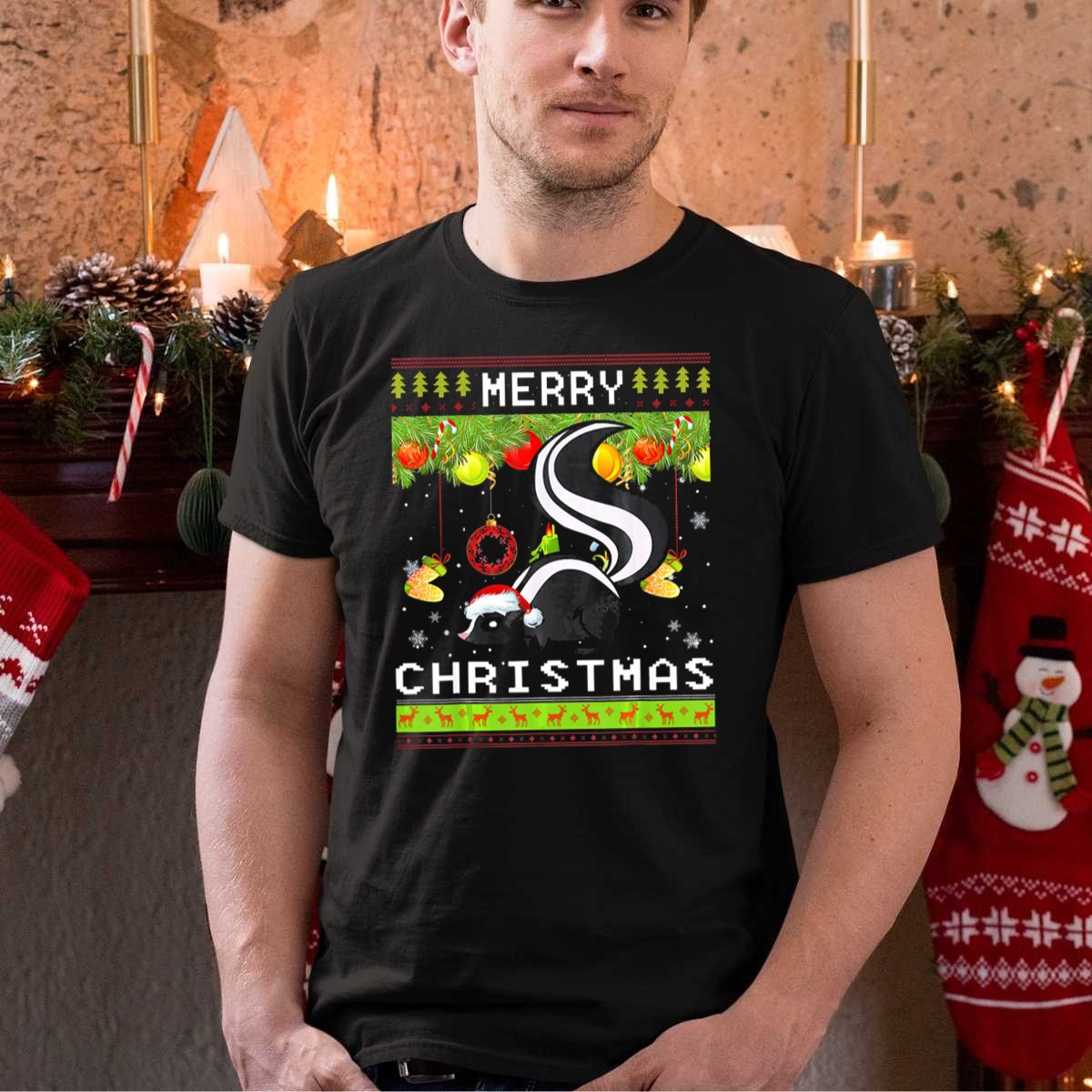 Be the first to review “Merry Christmas Skunk With Santa Hat And Holiday Decorations T Shirt”