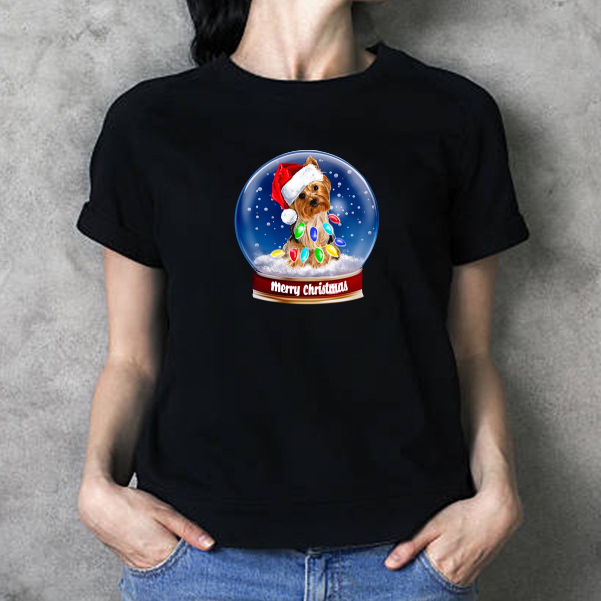 Be the first to review “Merry Christmas Snow Globe Yorkshire Terrier With Santa Hat And Colorful Festive Lights T Shirt”