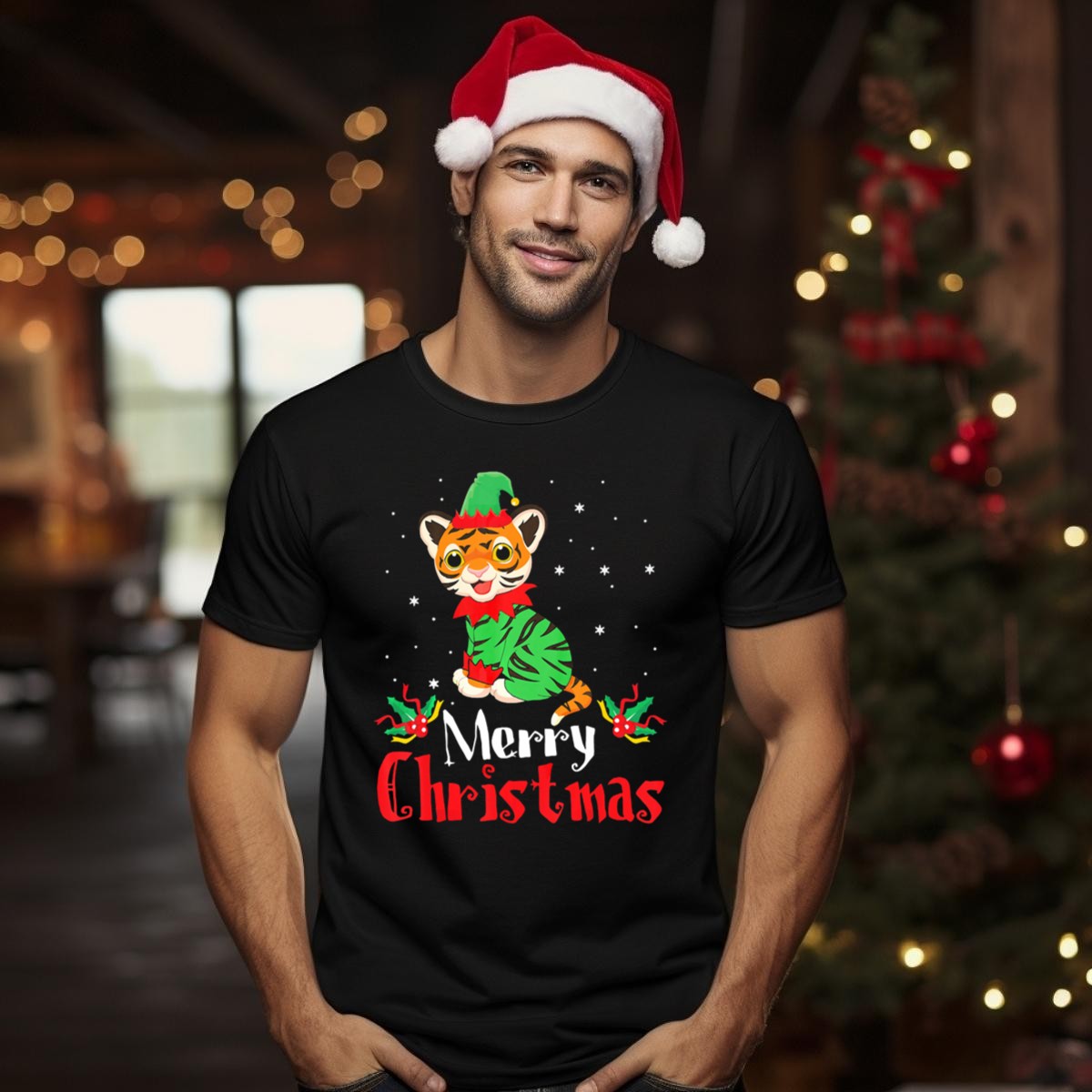 Be the first to review “Merry Christmas Tiger In Elf Costume With Festive Snowflakes T-Shirt”
