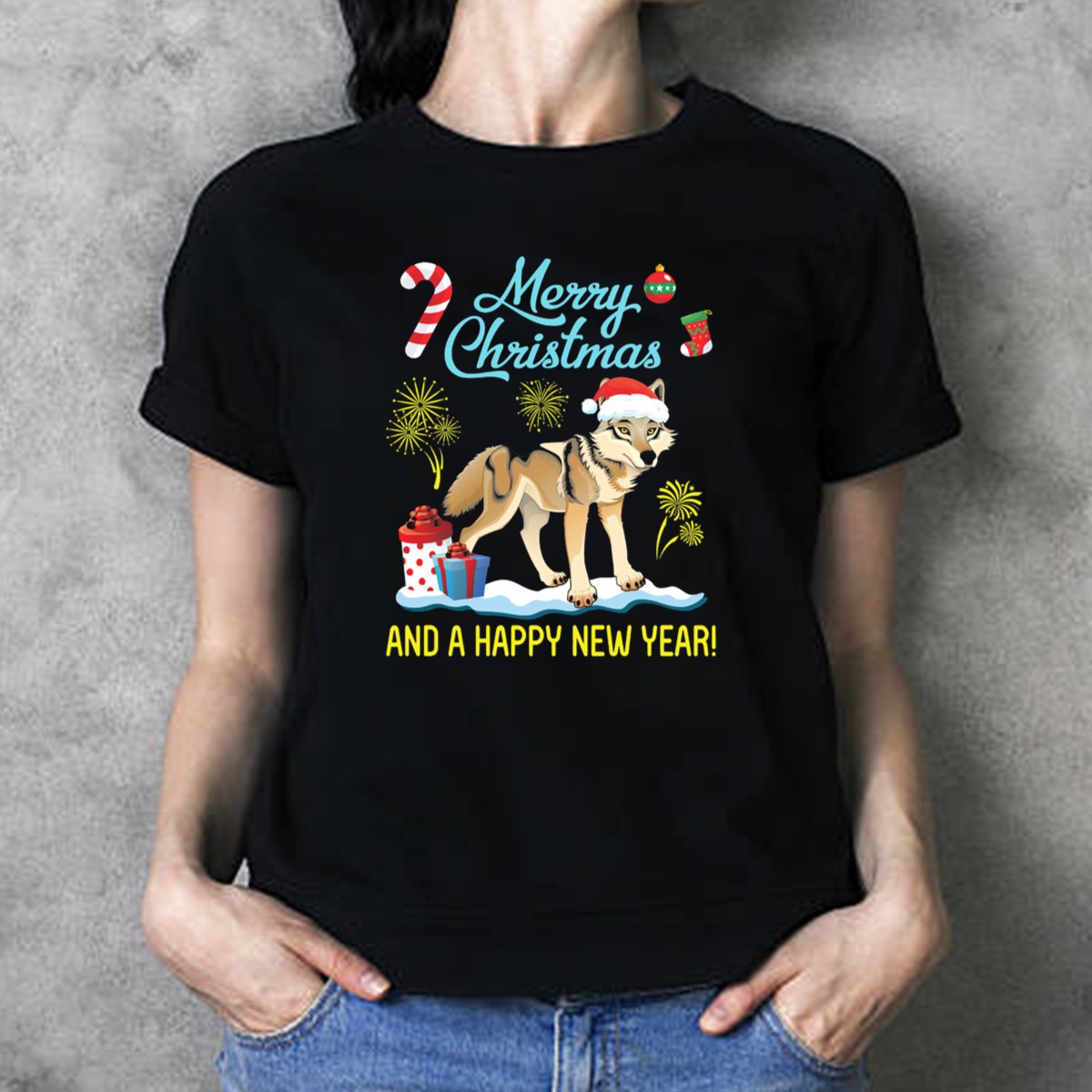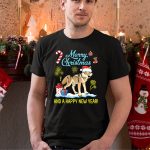 Merry Christmas Wolf With Santa Hat And Happy New Year Candy Cane And Gifts T-Shirt