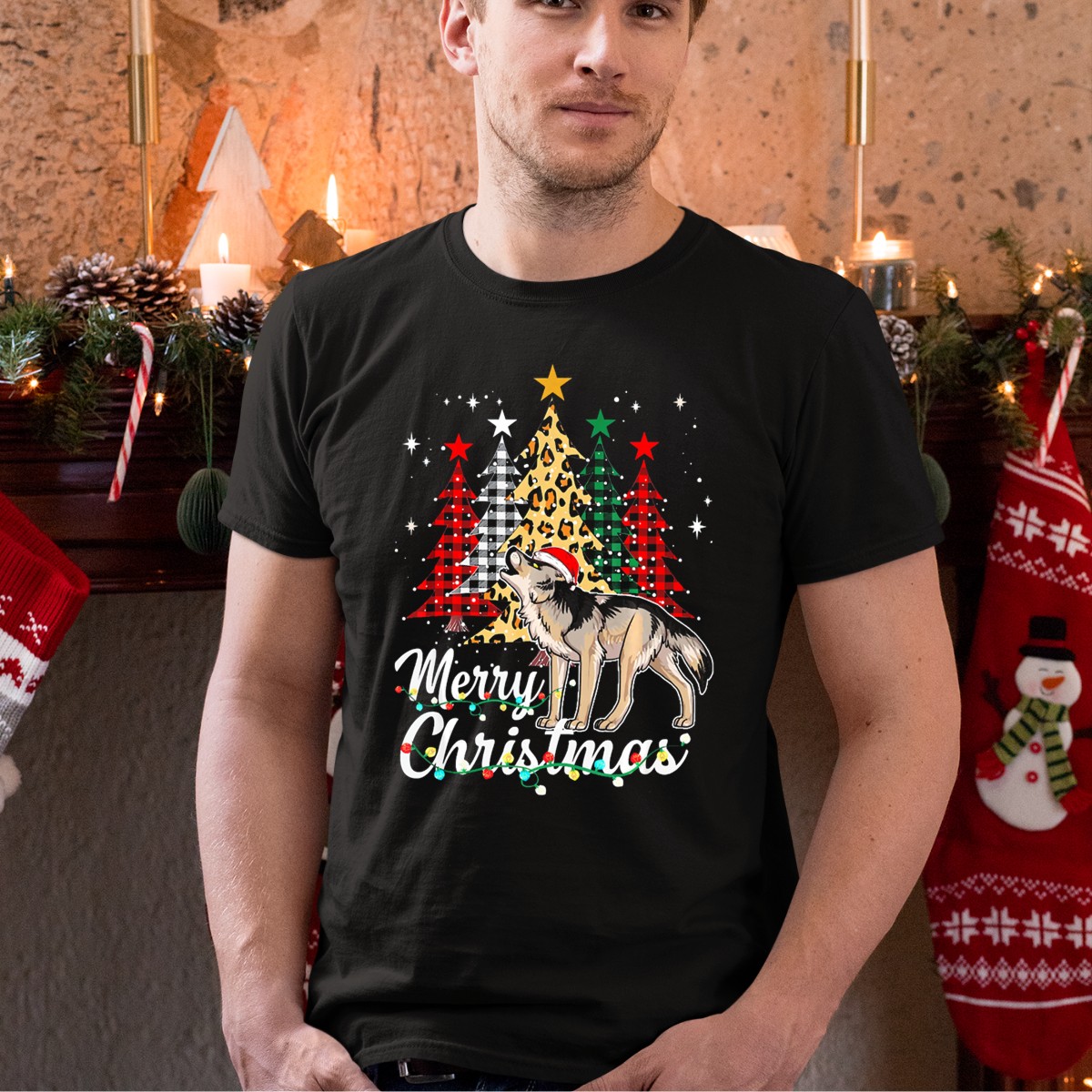 Be the first to review “Merry Christmas Wolf With Santa Hat Buffalo Plaid Leopard Trees T-Shirt”
