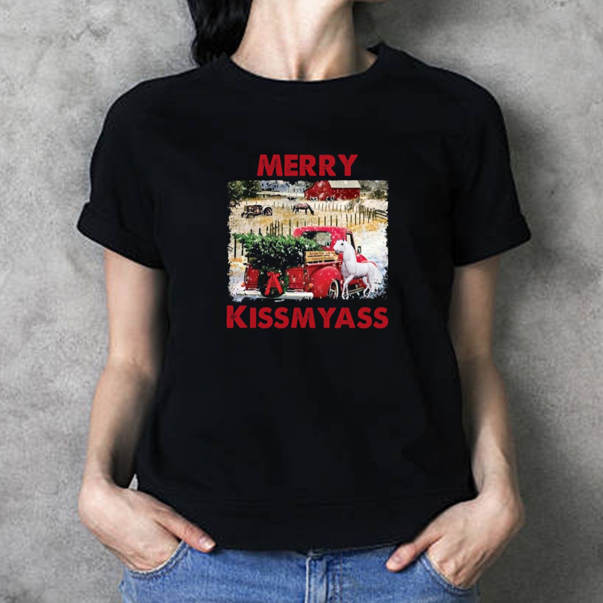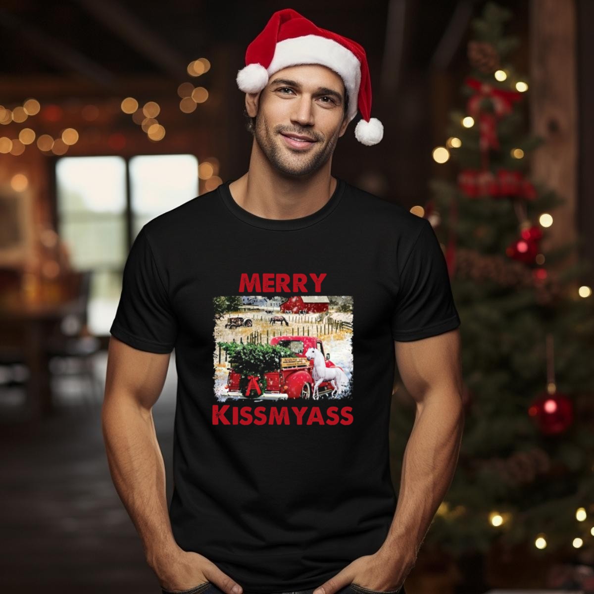 Get into the holiday spirit with our Merry Kissmyass Vintage Truck Christmas Scene T-Shirt! This fun and festive tee is perfect for anyone who loves whimsical designs and wants to celebrate the season in style. Ideal for casual wear, themed events, or just a cozy day at home, this shirt features a charming vintage truck set against a snowy farm landscape, complete with a horse for that extra touch of holiday cheer. Made in the USA, this fan-made design is sure to become a favorite in your winter wardrobe.