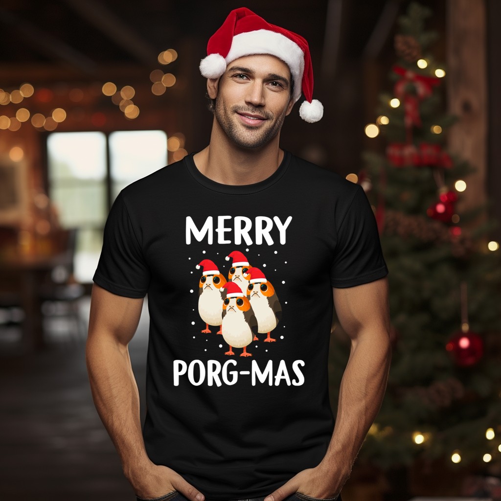 Celebrate the holiday season in style with our Merry Porg Mas Christmas T-shirt! This fan-made design features adorable festive Porgs donning Santa hats, perfect for Star Wars enthusiasts and casual wearers alike. Whether you’re attending a themed event, gathering with friends, or just spreading some holiday cheer, this shirt brings a unique touch of fun to your wardrobe. Crafted for comfort, it’s the ultimate choice for all your festive activities!