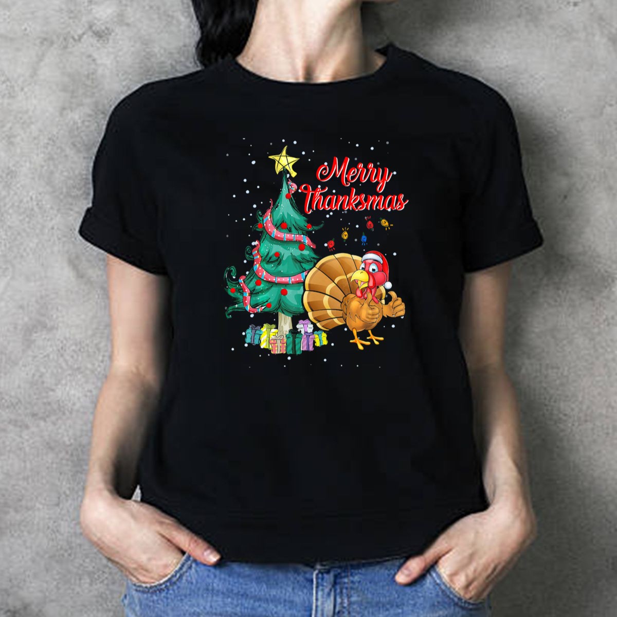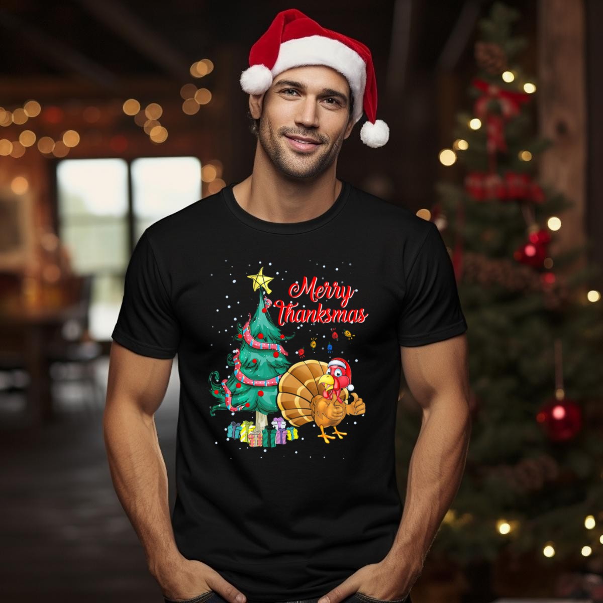 Celebrate the joyous blend of Christmas and Thanksgiving with our Merry Thanksmas T-Shirt! This fan-made design features a whimsical Christmas tree adorned with a turkey, Santa hat, and presents, making it the perfect choice for those who love to embrace the festive spirit. Ideal for casual outings, themed events, or simply lounging at home, this shirt is a fun way to showcase your holiday cheer all season long!