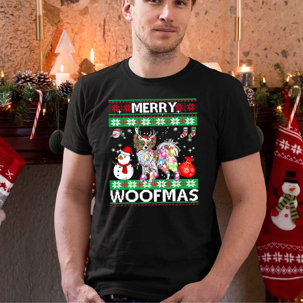 Celebrate the joyful spirit of the holiday season with our Merry Woofmas Papillon Christmas Lights Snowflakes Snowman Festive Scene T-Shirt! Designed for dog lovers and festive enthusiasts alike, this playful tee showcases an adorable Papillon surrounded by twinkling lights and cheerful snowflakes, making it the perfect choice for casual wear, themed events, or simply spreading holiday cheer wherever you go. Made with care and printed in the USA, this shirt is not just a piece of clothing, but a statement of your love for pets and the festive season!