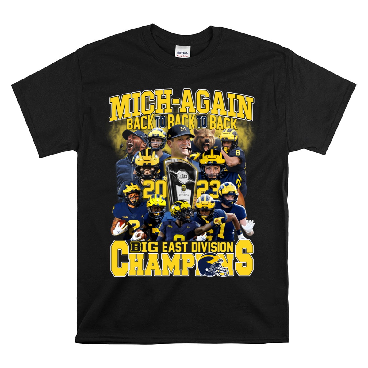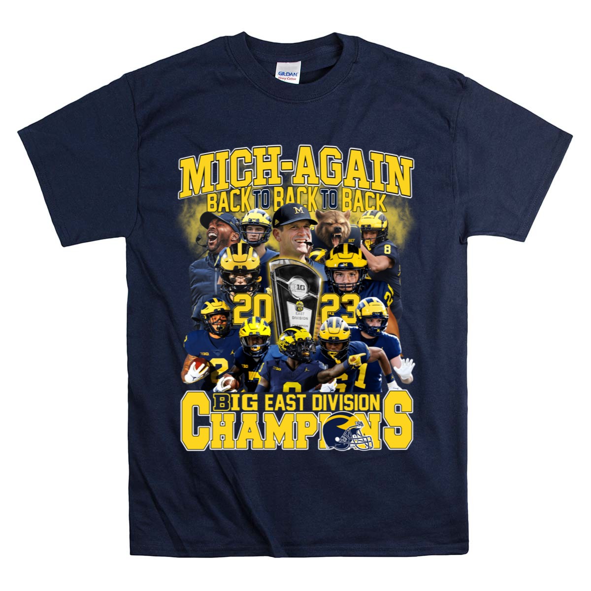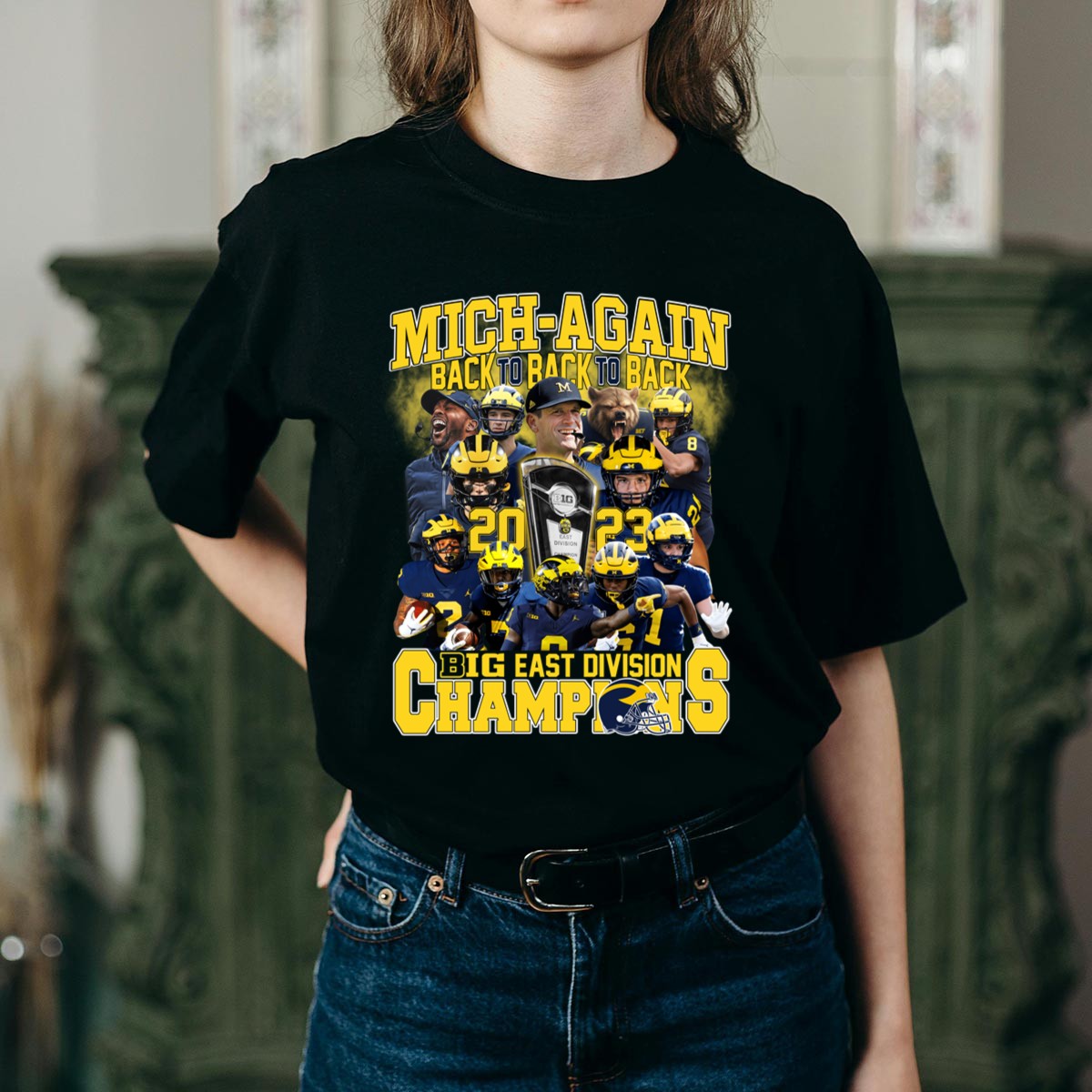 Show your unwavering support for the Wolverines with the Mich Again Back To Back To Back Big East Shirt! This fan-made design is perfect for true Michigan enthusiasts who want to celebrate their team’s remarkable achievements. Ideal for casual outings, themed events, or just lounging around, this shirt combines comfort and style, making it a must-have for any die-hard fan. Proudly printed in the USA, it’s not just a shirt; it’s a statement of loyalty.