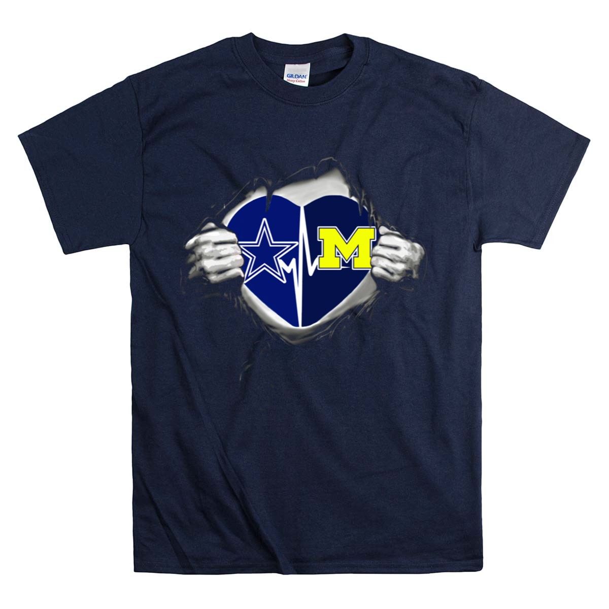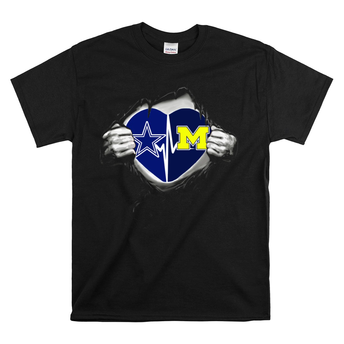 Show off your dual allegiance with the Michigan Wolverines Dallas Cowboys Heart Torn T-Shirt! Perfect for fans who appreciate both teams, this shirt is designed for comfort and style, making it ideal for casual outings, game days, or themed events. The eye-catching fan-made design is printed right here in the USA, ensuring you stand out wherever you go!