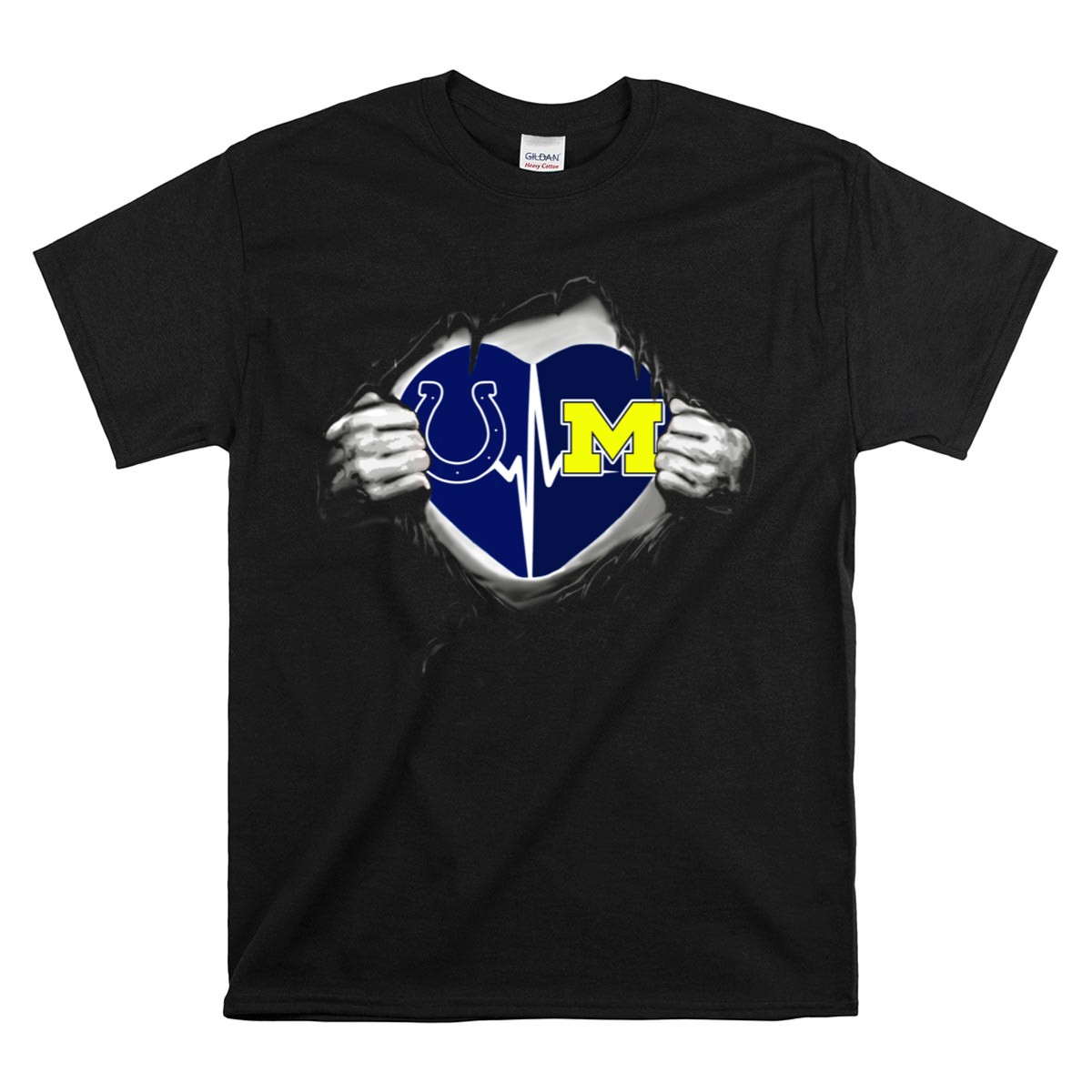 Show your love for both the Michigan Wolverines and the Indianapolis Colts with this unique Heartbeat Logo Fusion T-Shirt. Perfect for fans who want to express their team spirit in a stylish and comfortable way, this shirt is ideal for casual outings, themed events, or simply lounging at home. Made with a fan-made design that showcases your dual allegiance, it’s printed in the USA for quality you can trust.