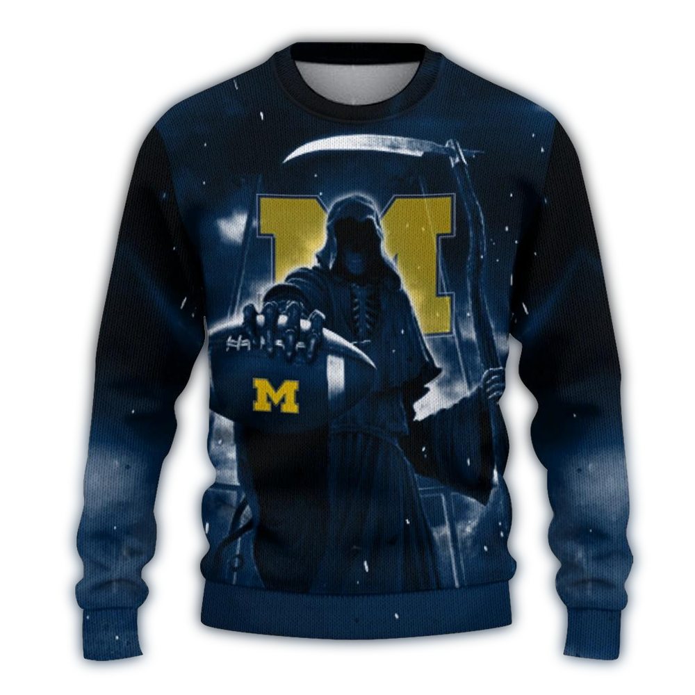 Get ready to showcase your team spirit with the Michigan Wolverines Reaper Scythe Ugly Sweater! Perfect for die-hard fans and casual wearers alike, this festive piece is a must-have for game days, holiday parties, or cozy nights in. Its unique design captures the essence of fun and rivalry, making it a standout addition to any winter wardrobe.