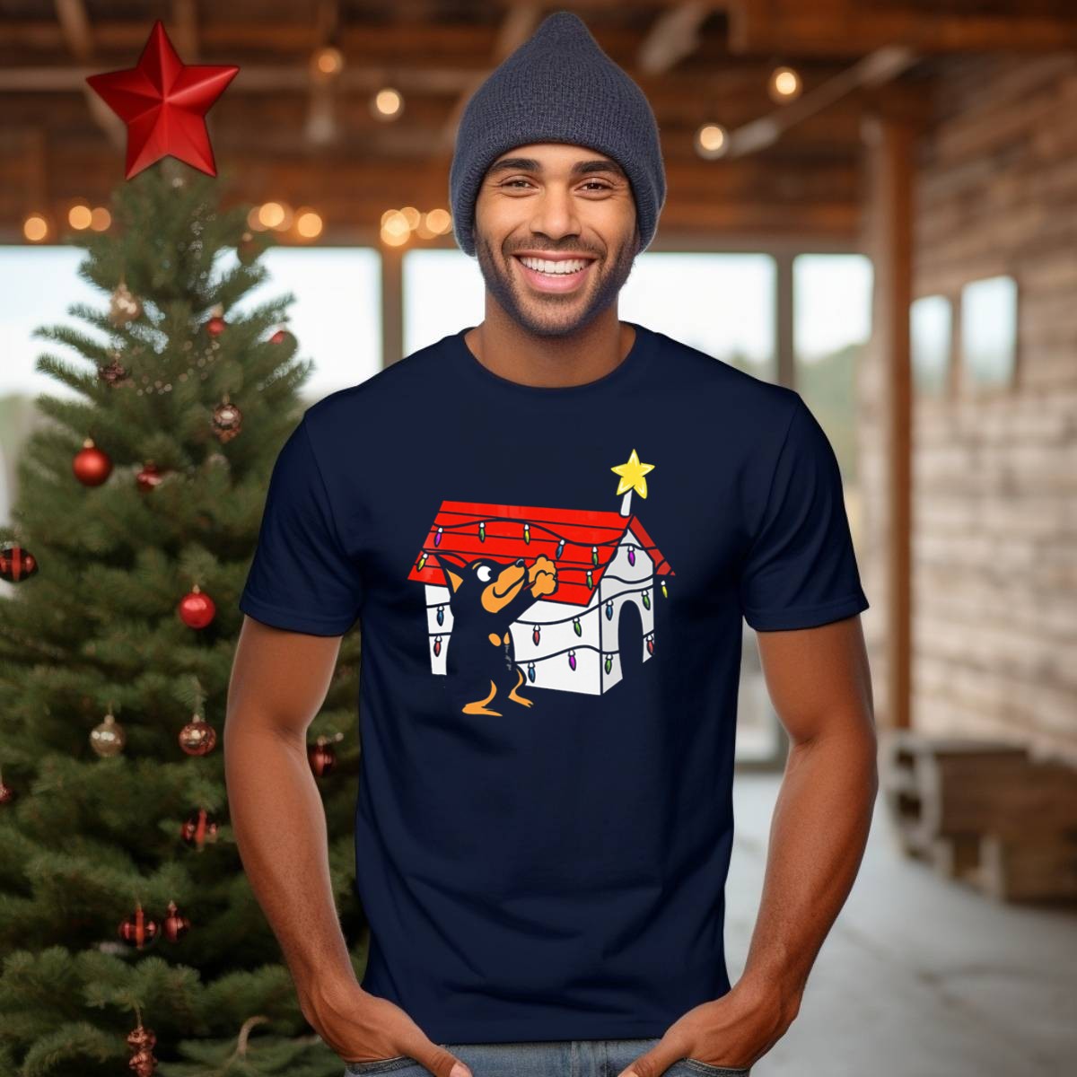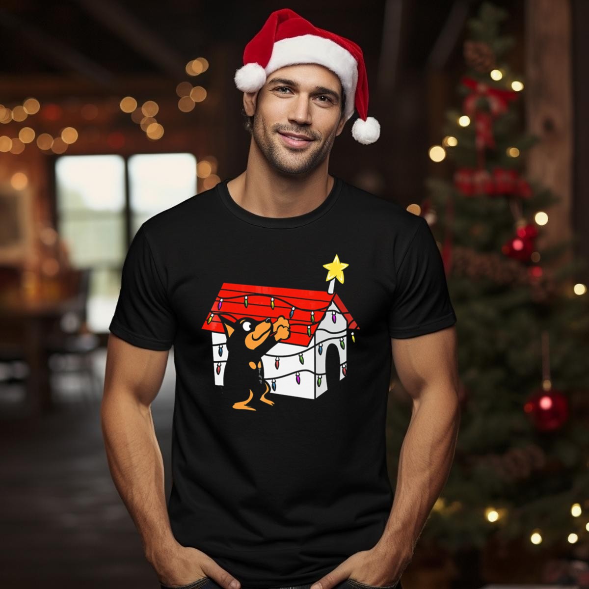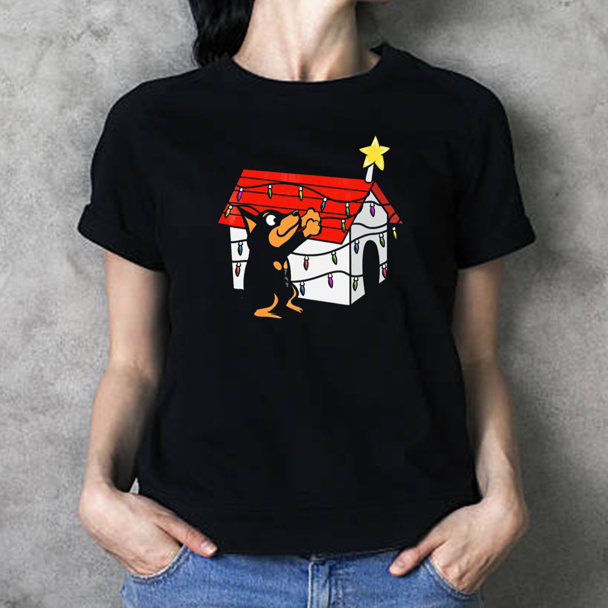 Celebrate your love for Miniature Pinschers with this delightful graphic printed T-shirt featuring a charming doghouse Christmas ornament adorned with festive lights and a shining star. Perfect for dog lovers and holiday enthusiasts alike, this shirt brings a joyful spirit to casual wear, themed events, or simply spreading cheer during daily outings. Made in the USA, the unique fan-made design ensures that you stand out in style while showcasing your passion for your furry friends.