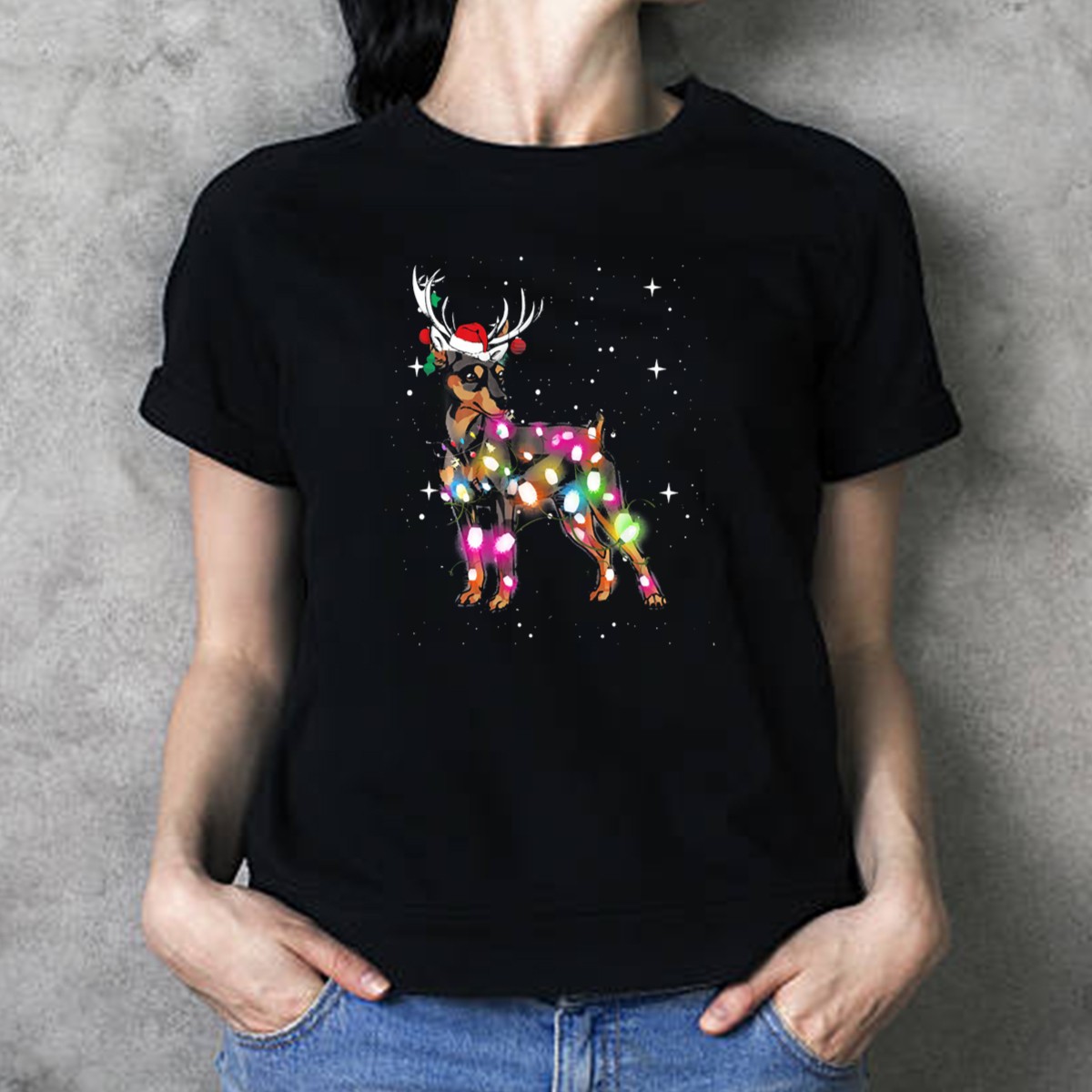 Celebrate the festive spirit with our Miniature Pinscher Reindeer T-Shirt, perfect for dog lovers and holiday enthusiasts alike! This charming graphic tee features an adorable Miniature Pinscher adorned with Christmas lights and a Santa hat, making it a delightful addition to your casual wardrobe. Ideal for themed events, family gatherings, or simply spreading cheer during the holiday season, this shirt is sure to be a conversation starter wherever you go.