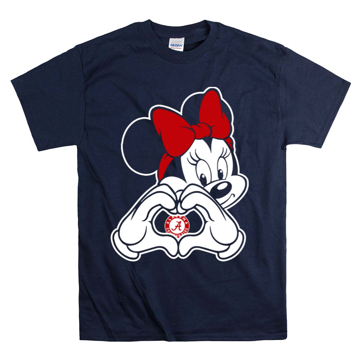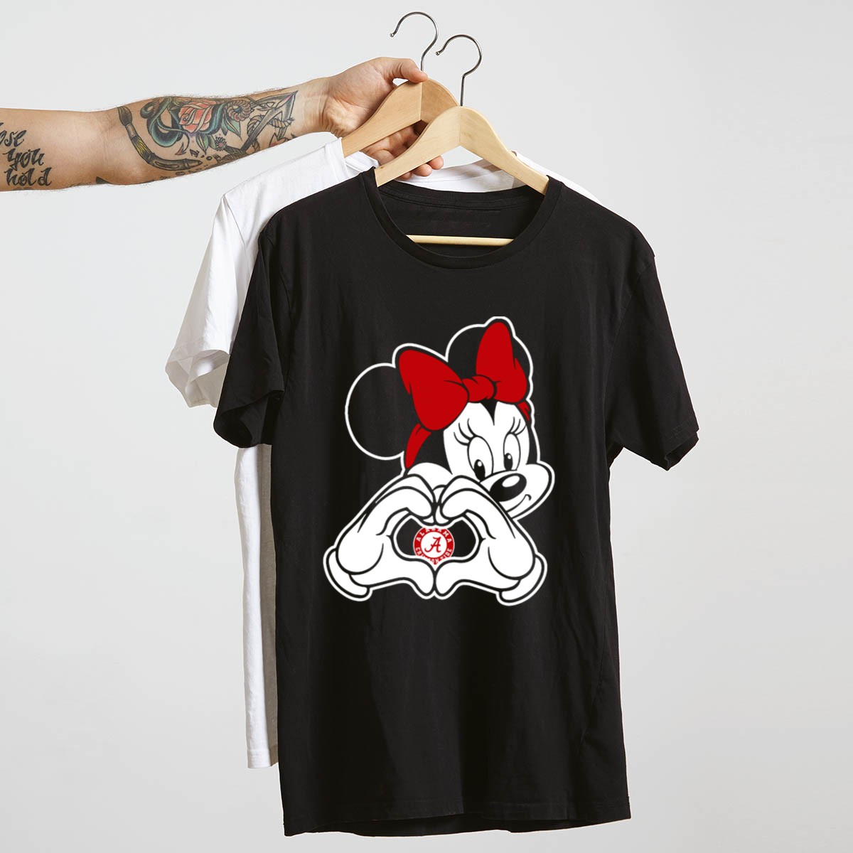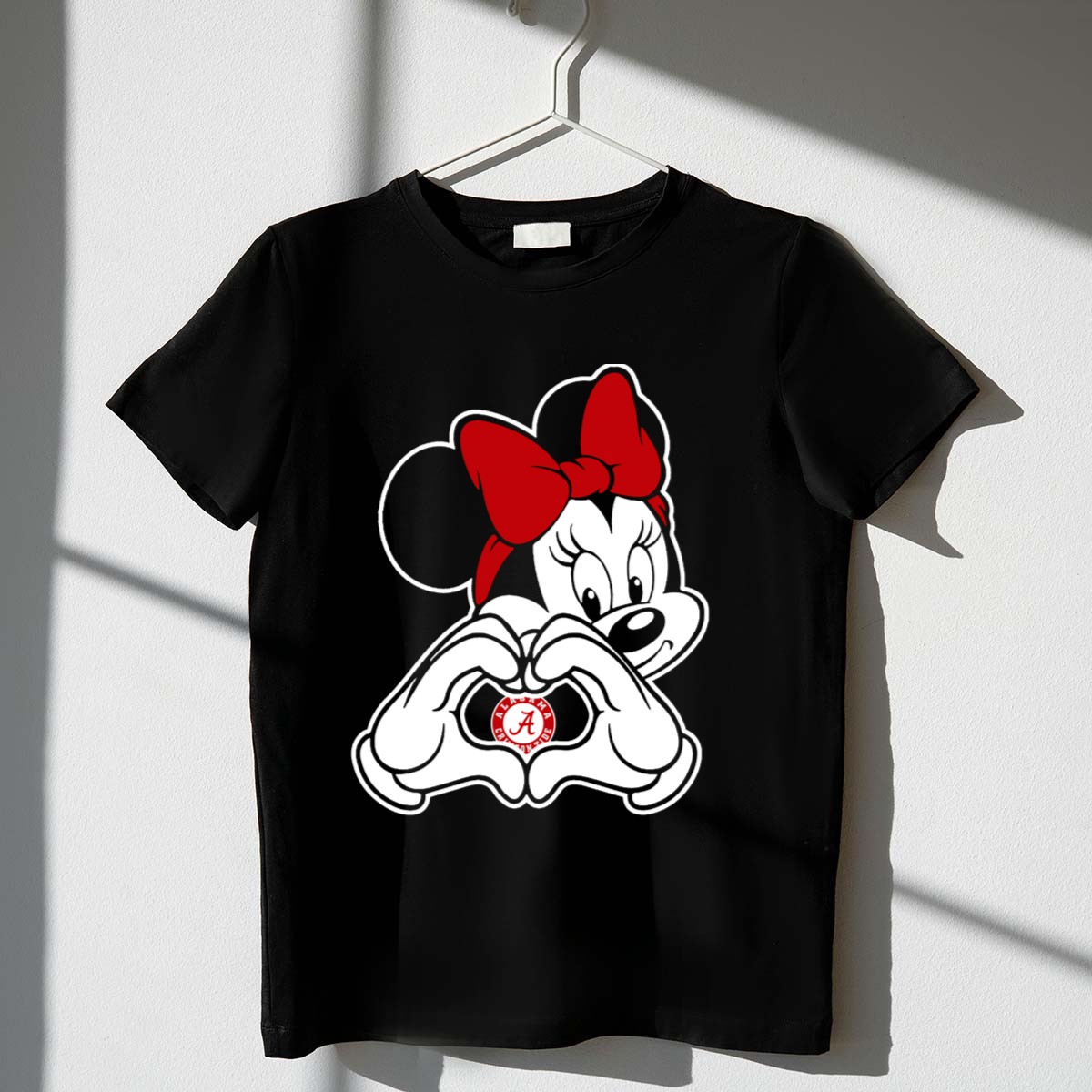 Show your love for both Minnie Mouse and the Alabama Crimson Tide with our heart hands logo T-shirt! This fan-made design beautifully merges your passion for college sports with a touch of Disney magic, making it the perfect choice for game days, themed events, or casual outings. Crafted for comfort and style, this shirt is sure to become a beloved staple in your wardrobe.