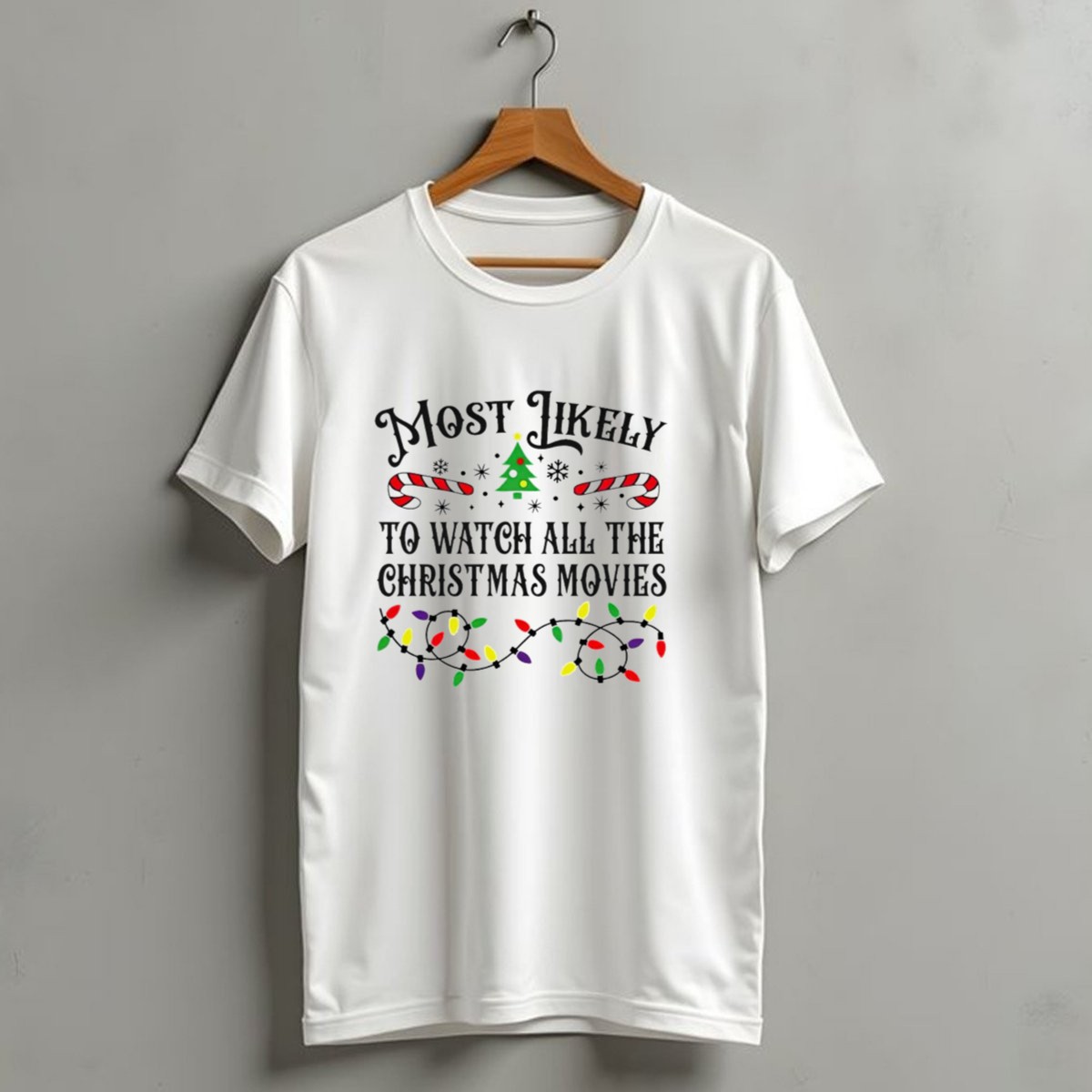Be the first to review “Most Likely To Watch All The Christmas Movies With Lights And Candy Canes T-Shirt”