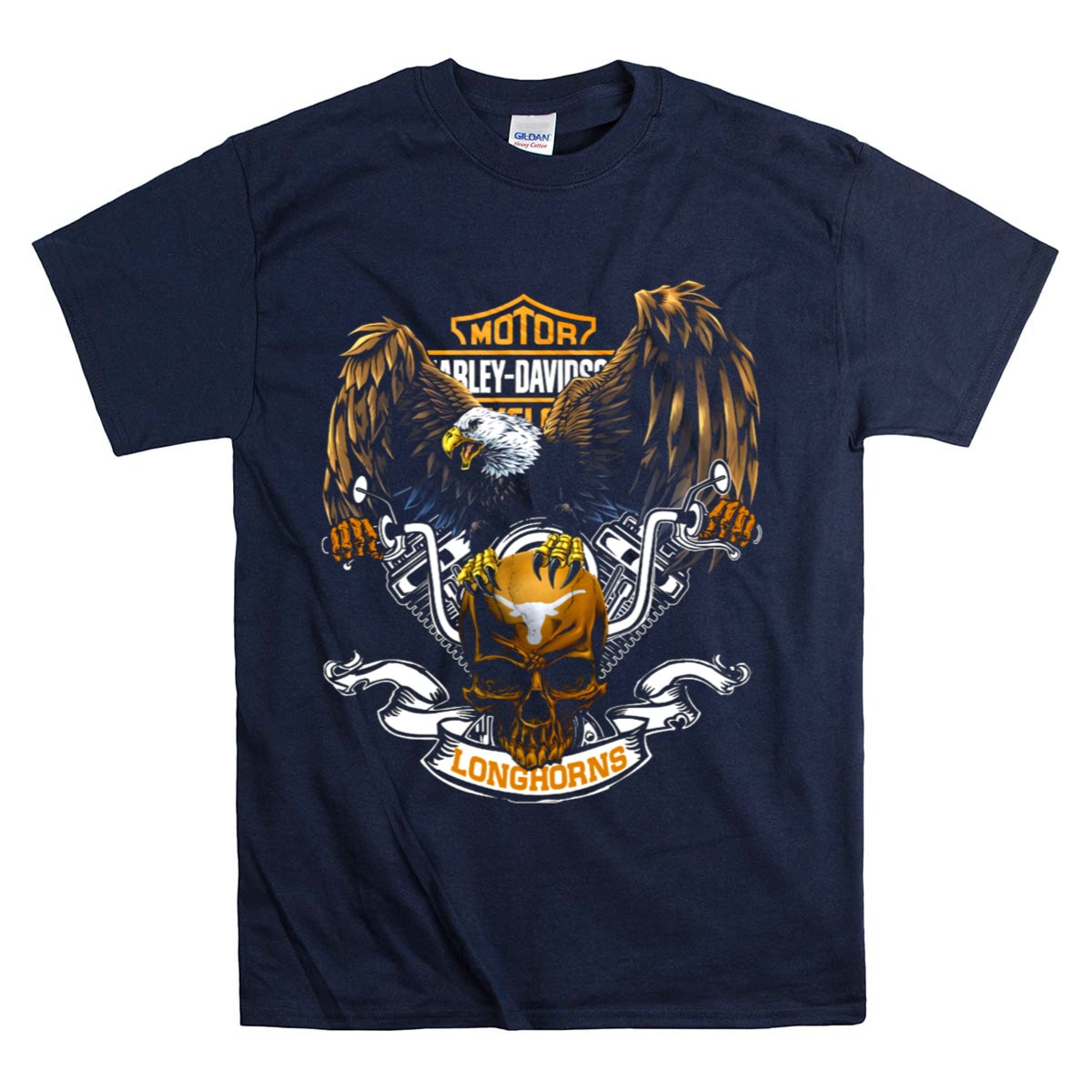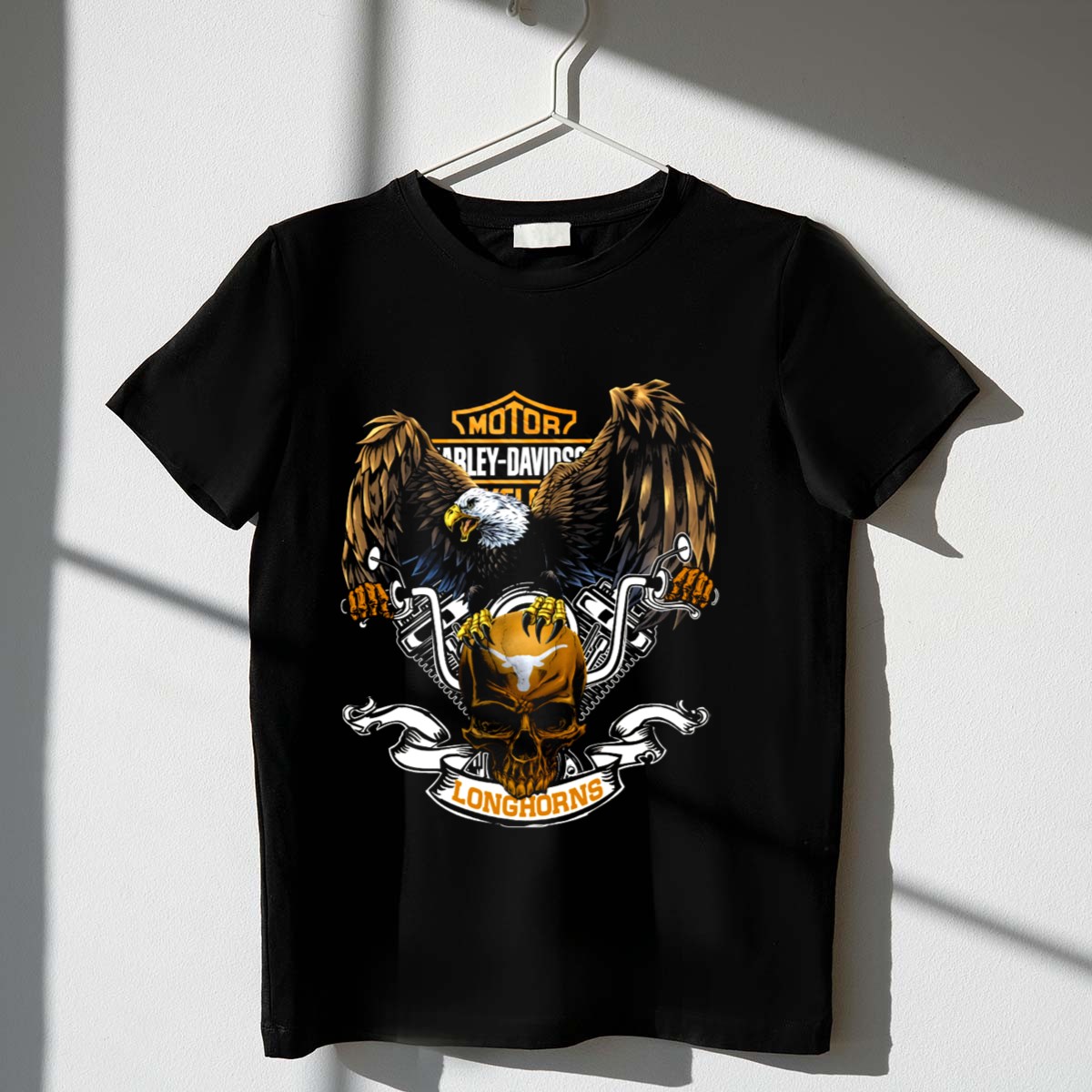Unleash your wild side with our Motor HD Cycles Texas Longhorns Eagle Skull T-Shirt, perfect for those who embrace the spirit of adventure. This fan-made design showcases a bold eagle skull intertwined with Texas Longhorn motifs, making it an eye-catching choice for motorcycle enthusiasts and supporters of the Texas Longhorns alike. Ideal for casual outings, themed events, or simply showcasing your love for the Lone Star State, this shirt combines comfort and style effortlessly, ensuring you stand out in any setting.