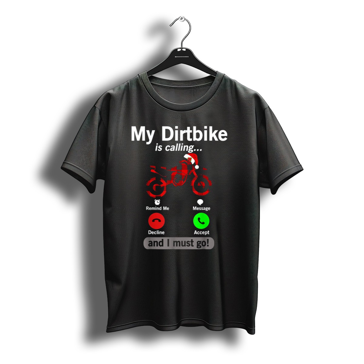 Get ready to rev up your holiday spirit with our “My Dirt Bike Is Calling Remind Me Decline Accept And I Must Go” T-shirt, featuring a playful Santa hat design that’s perfect for dirt bike enthusiasts! This fan-made graphic tee is ideal for casual wear, themed events, or just lounging around during the festive season. Crafted for comfort and style, it’s a unique addition to your wardrobe that celebrates your passion for dirt biking while embracing the holiday cheer!