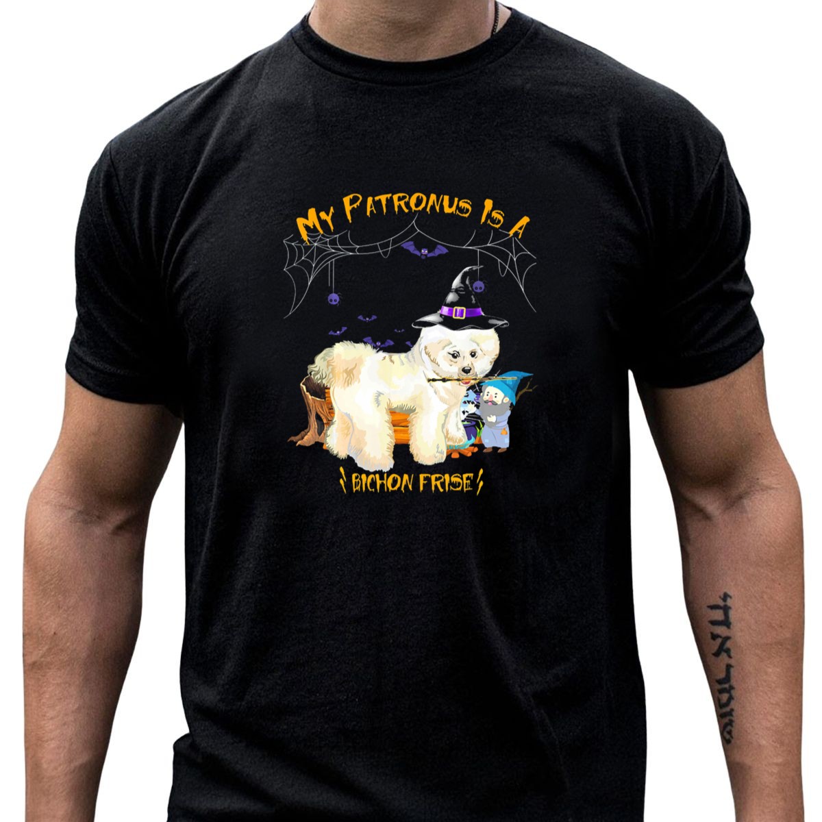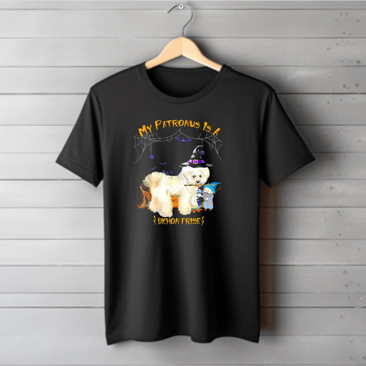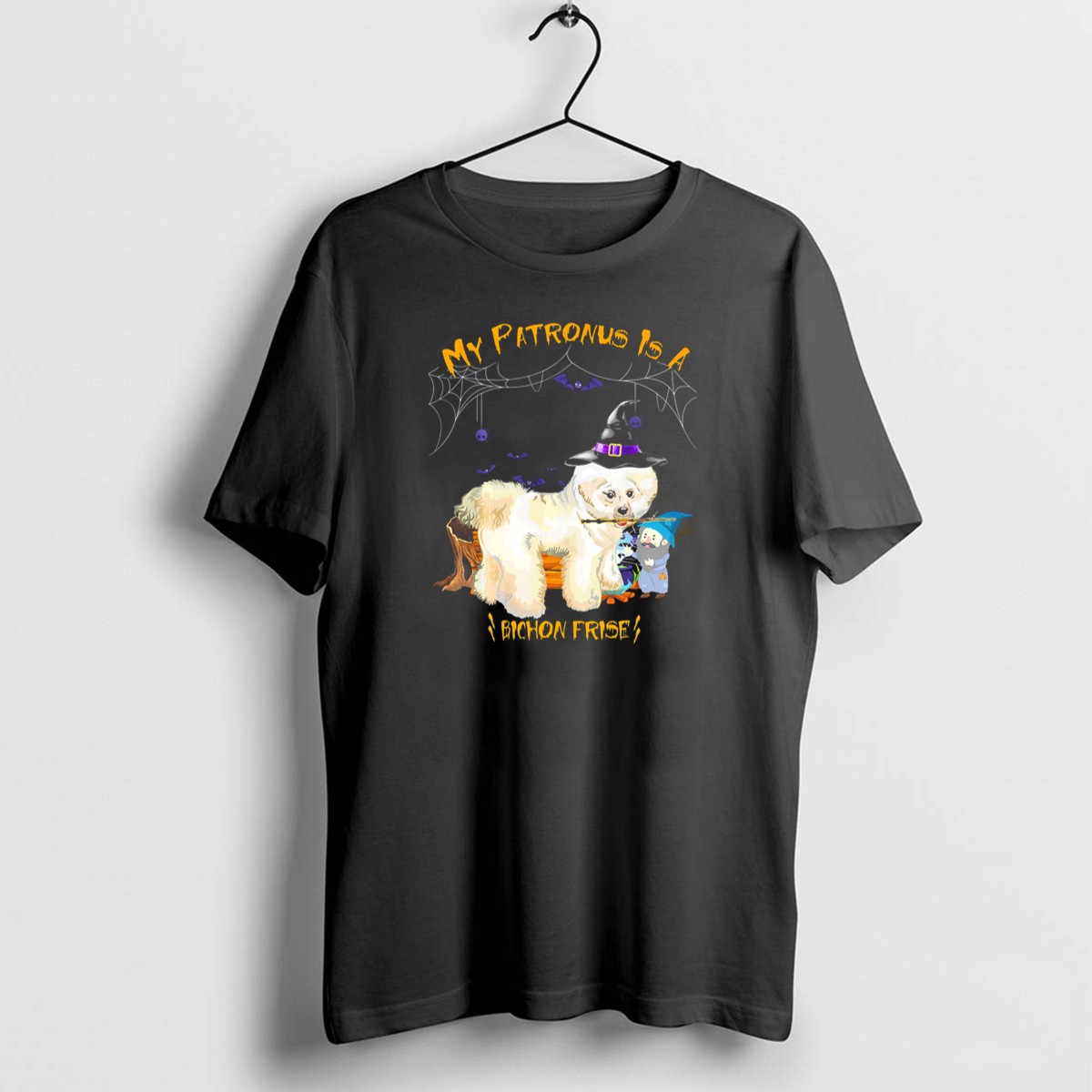 Celebrate your love for the whimsical with our “My Patronus Is A Bichon Frise” T-shirt, perfect for dog lovers and Harry Potter fans alike! This enchanting design features a charming Bichon Frise adorned with a wizard hat, surrounded by spider webs, making it an ideal choice for Halloween festivities, themed events, or just casual wear. Made for those who appreciate unique fan-made creations, this shirt is printed in the USA and is sure to spark conversations wherever you go.
