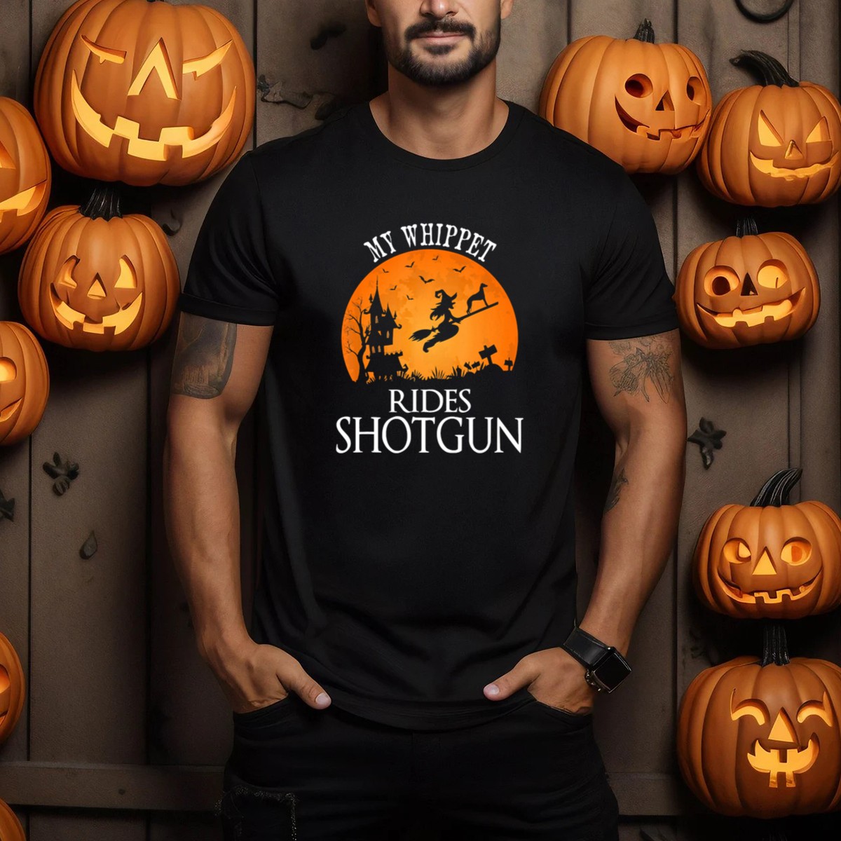 My Whippet Rides Shotgun Witch Broomstick Halloween Scene T-Shirt