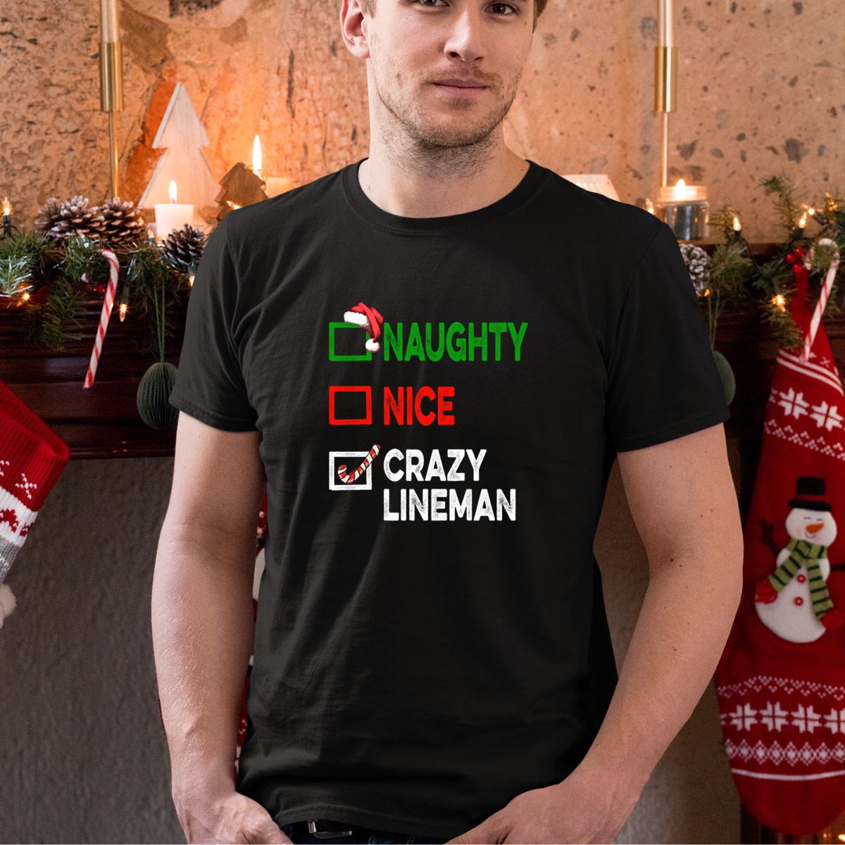 Get into the holiday spirit with our “Naughty Nice Crazy Lineman Christmas Santa Hat Candy Cane” T-shirt! Perfect for linemen who love to showcase their festive side, this shirt is ideal for casual wear, themed events, or just spreading cheer during the holiday season. Made with a fan-made design printed in the USA, it combines comfort with a playful holiday theme that is sure to turn heads and spark smiles.