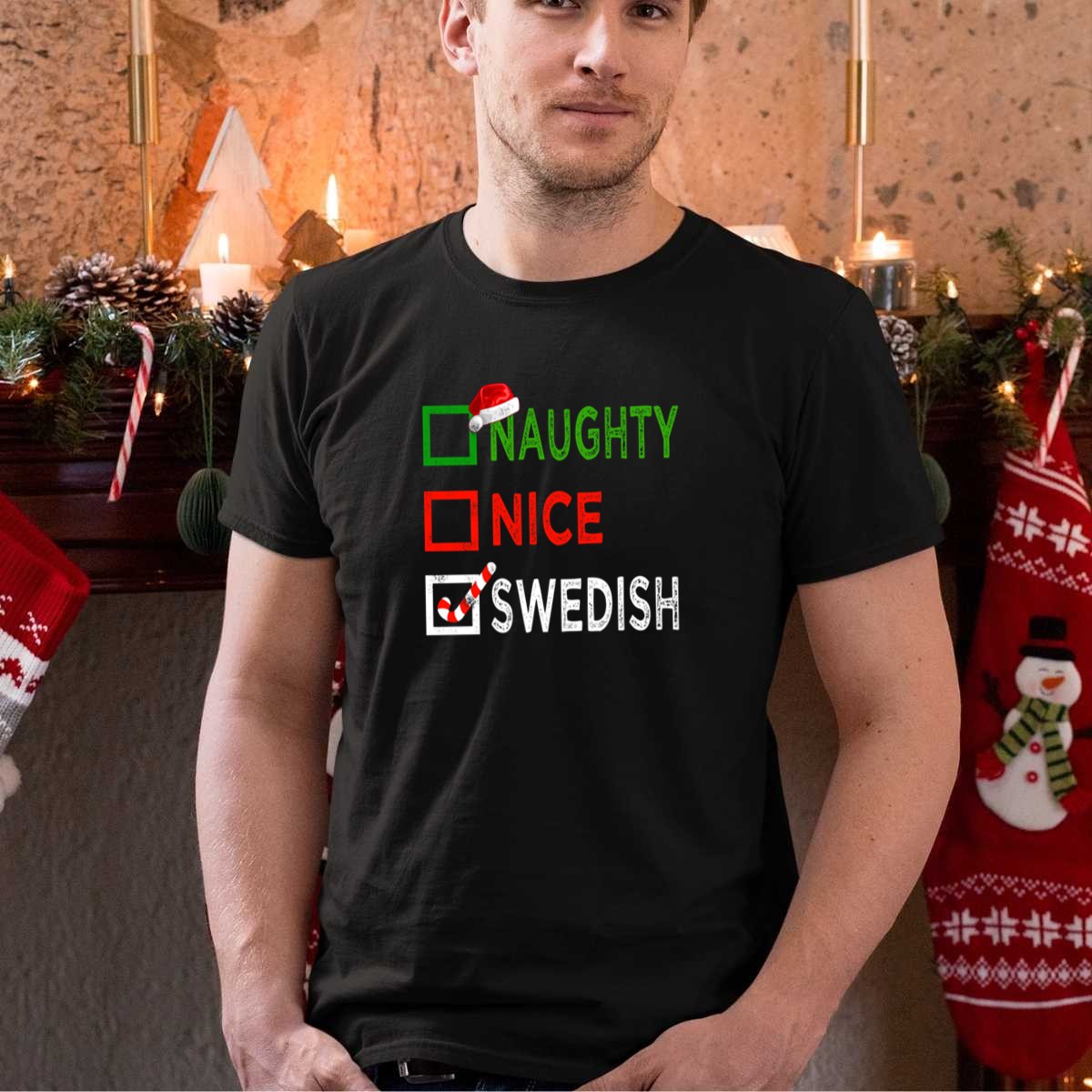 Be the first to review “Naughty Nice Swedish Christmas Checkboxes With Santa Hat And Candy Cane T Shirt”