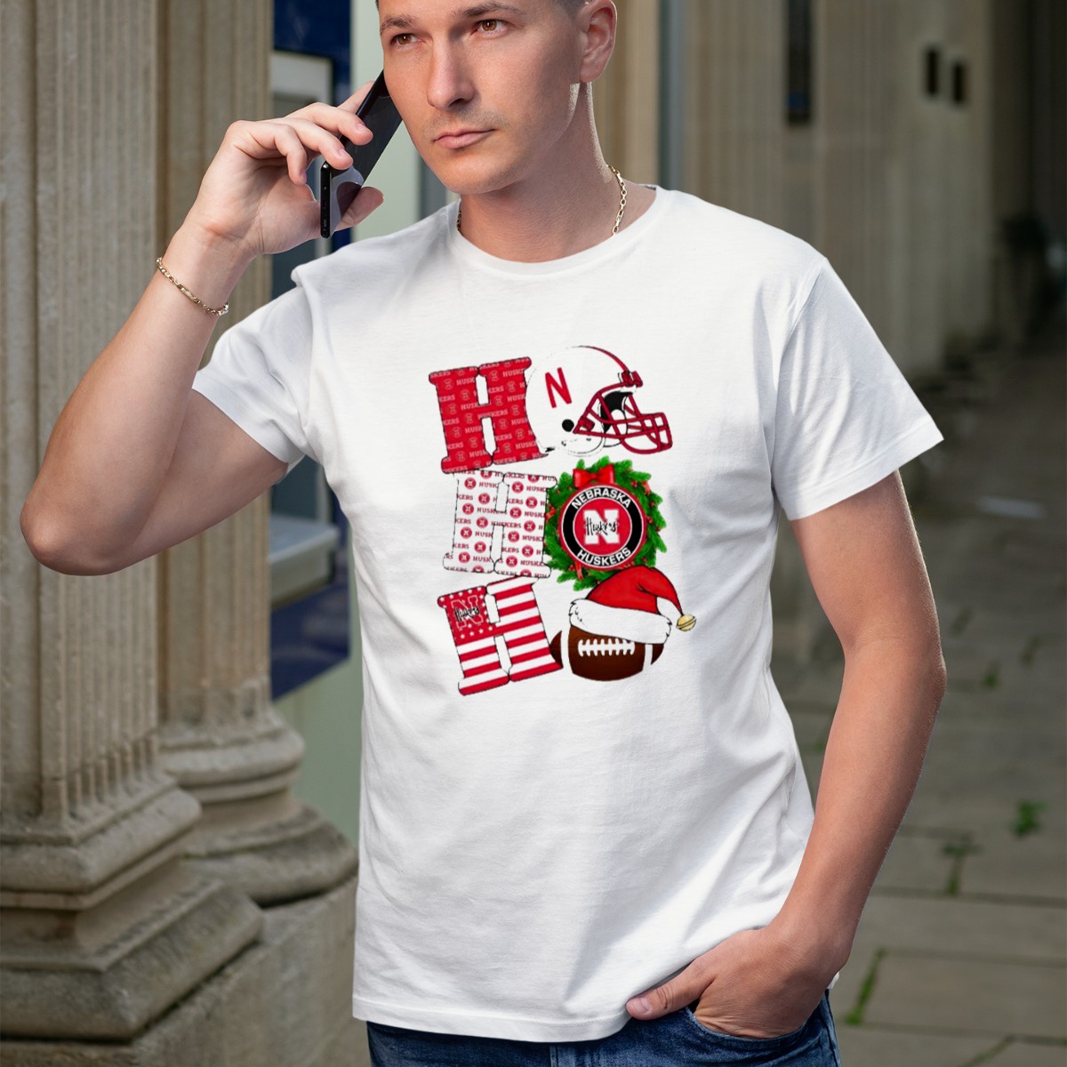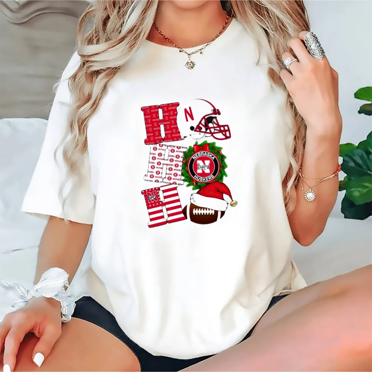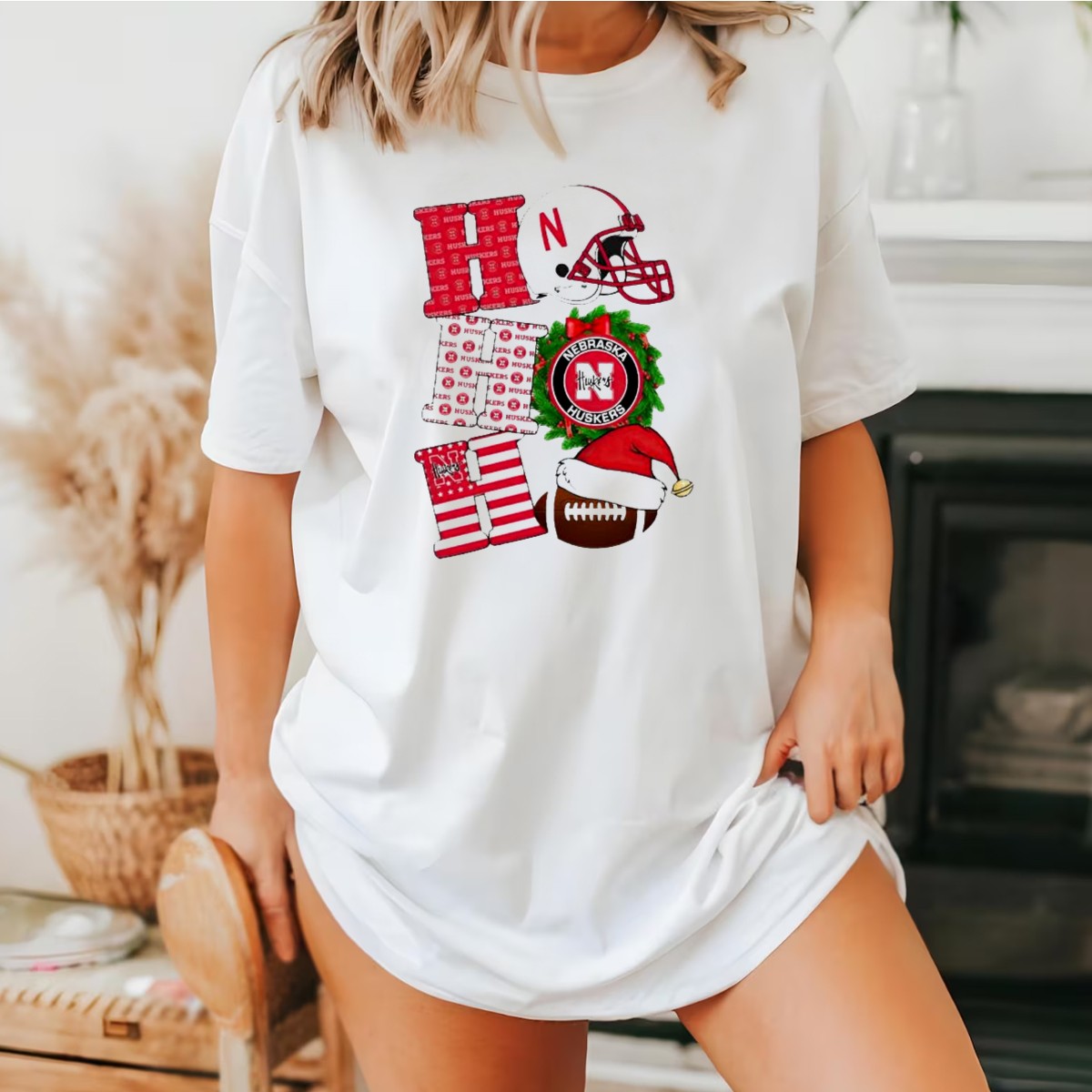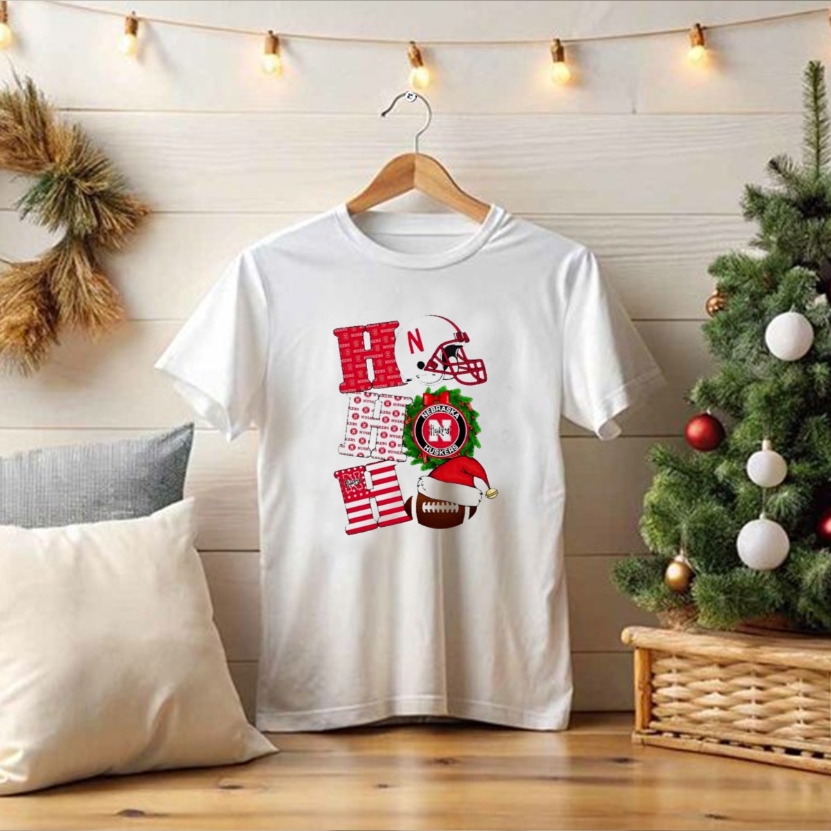 Celebrate the holiday season with the Nebraska Cornhuskers Ho Ho Ho Christmas Football Helmet Wreath Santa Hat T-Shirt! Perfect for die-hard fans who want to show their team spirit while embracing the festive cheer, this shirt is ideal for casual outings, themed events, or daily wear during the holidays. Made for comfort and style, this fan-made design proudly reflects your love for the Cornhuskers while adding a playful touch to your wardrobe.