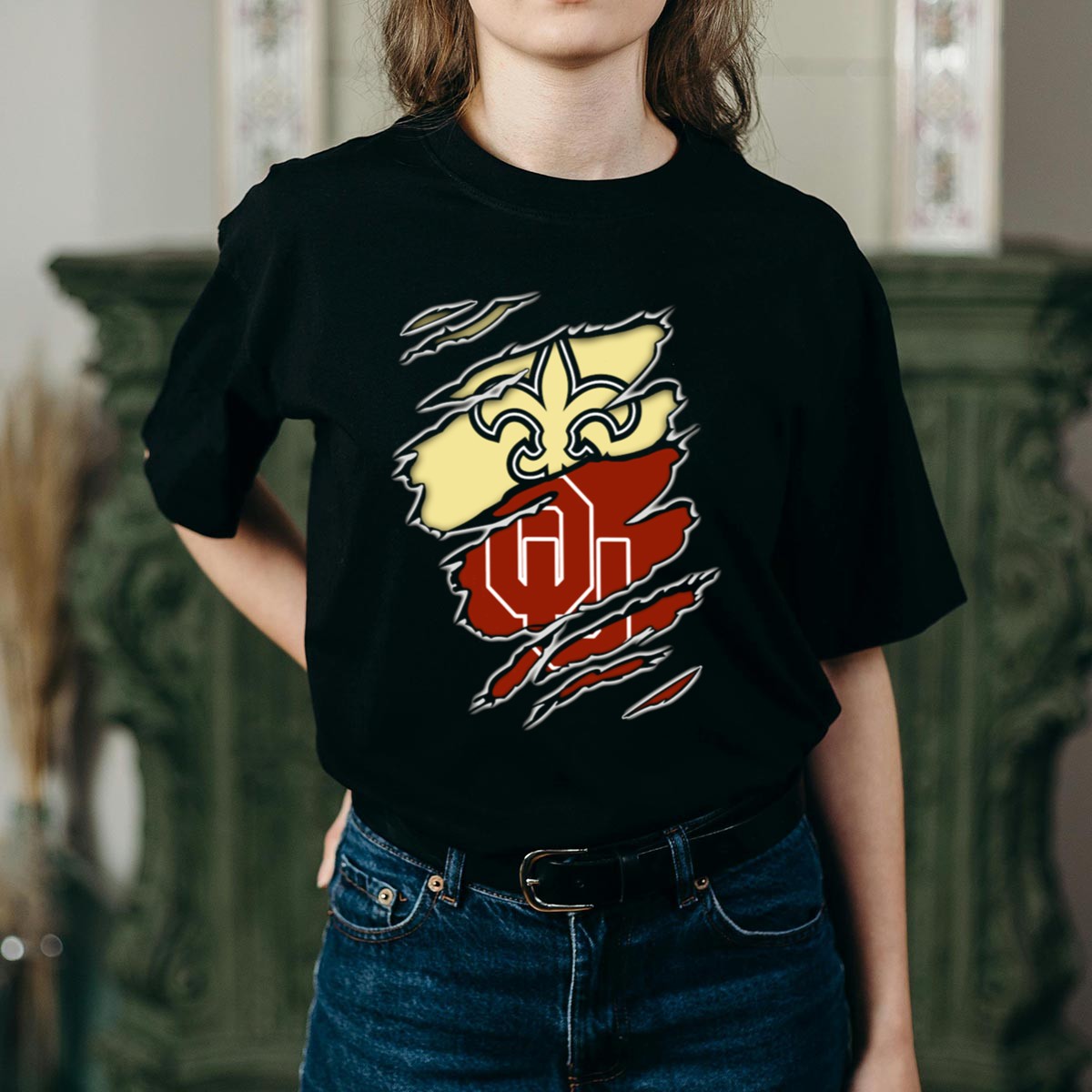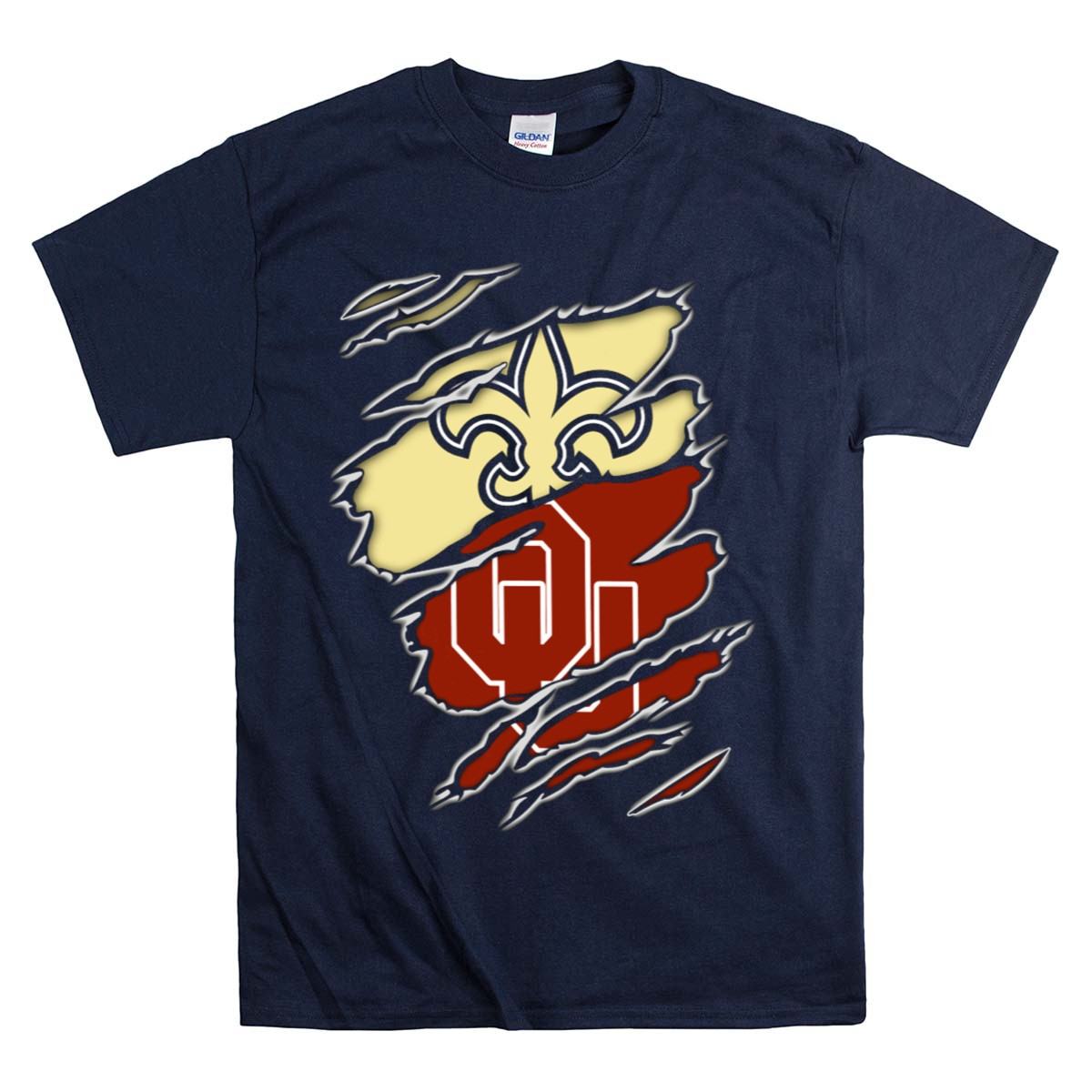 Celebrate your love for both the New Orleans Saints and Oklahoma Sooners with this unique Torn Logo Fusion T-shirt! Perfect for fans who cherish the spirit of both teams, this shirt is ideal for casual outings, themed events, or just showing off your team pride in daily wear. Made in the USA, this fan-made design combines style and passion, making it a must-have addition to any sports enthusiast’s wardrobe.