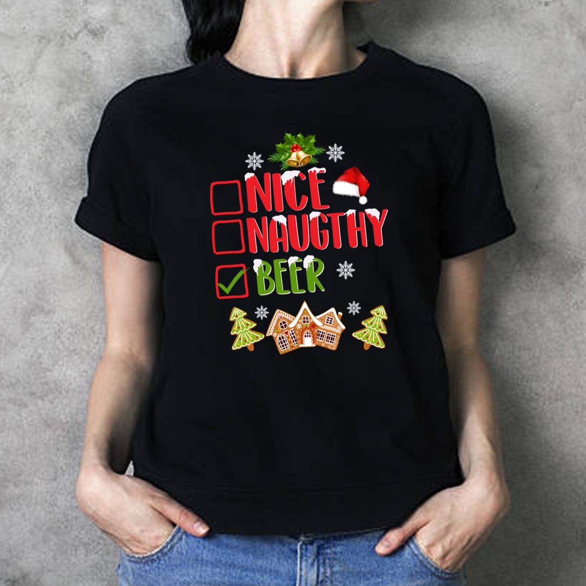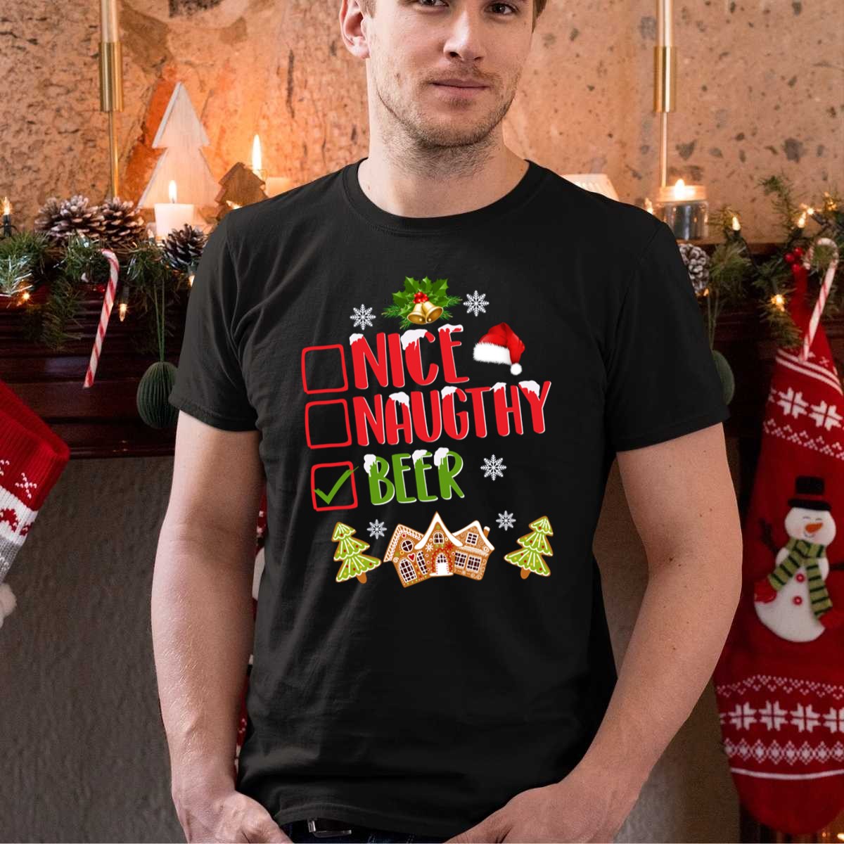 Be the first to review “Nice Naughty Beer Christmas Checklist Gingerbread House And Trees T-Shirt”
