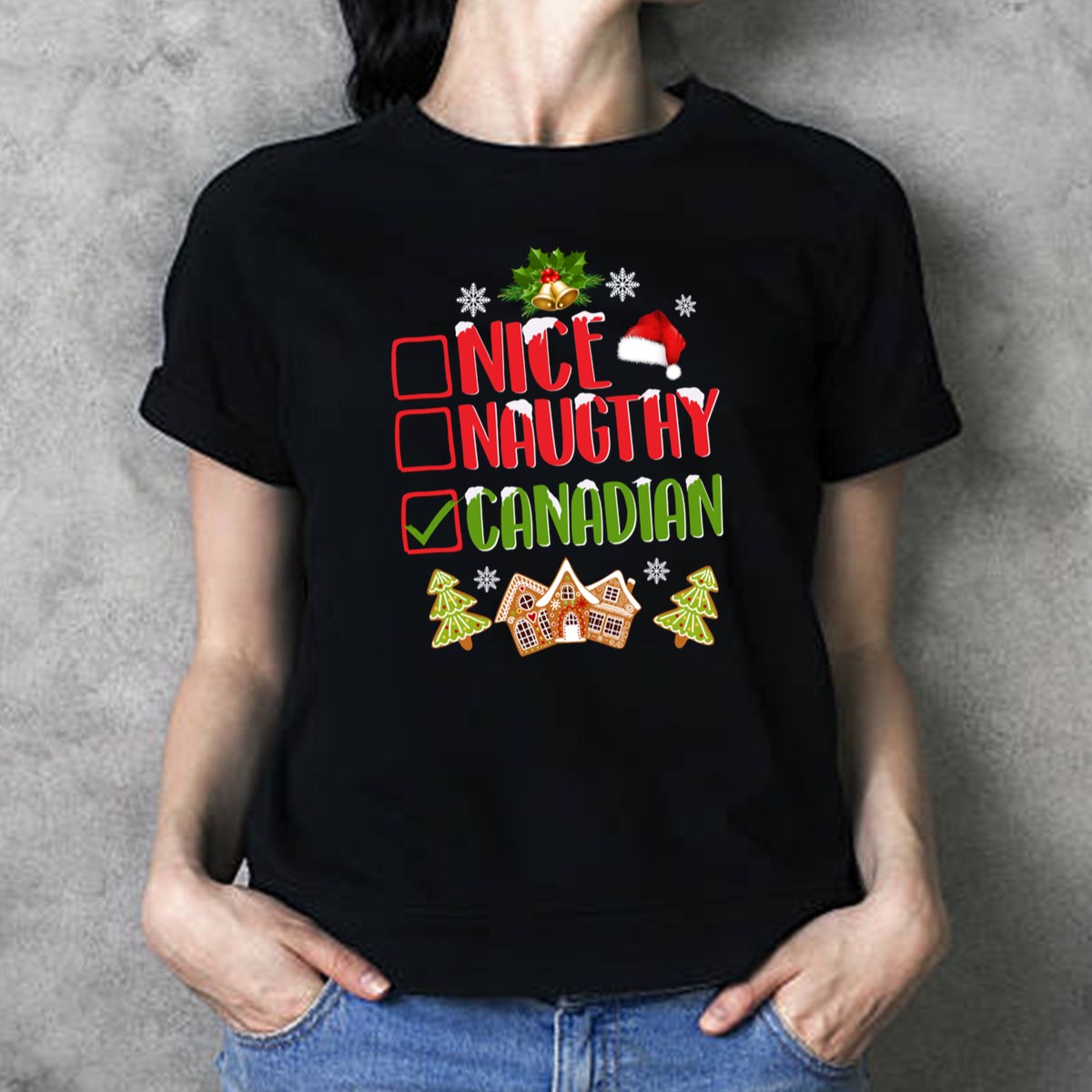Embrace the festive spirit with our Nice Naughty Canadian Christmas T-Shirt, perfect for those who love to celebrate the holiday season in style! This fan-made design features charming snowflakes and a whimsical gingerbread house, making it an ideal choice for casual wear, themed events, or just spreading holiday cheer throughout your daily activities. Crafted for comfort and durability, this shirt is a delightful addition to any festive wardrobe.