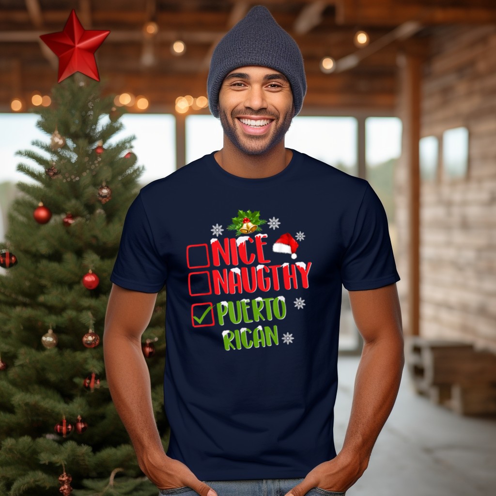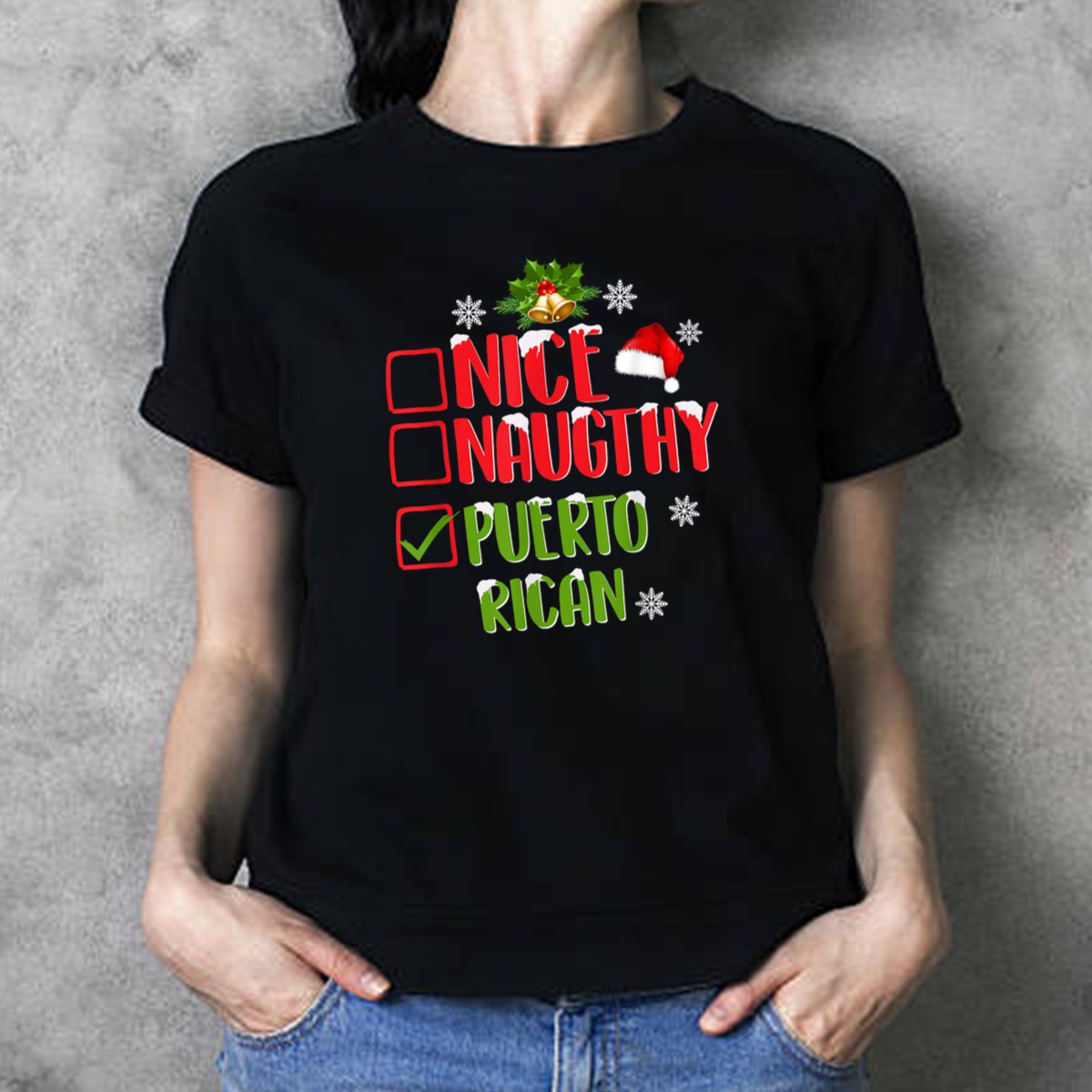 Celebrate the festive spirit with our “Nice Naughty Puerto Rican Christmas Checkboxes” T-shirt, perfect for those who love to embrace the holiday season with a twist of humor! This fan-made design features whimsical checkboxes, a Santa hat, and charming snowflakes, making it an ideal choice for casual wear, themed events, or daily outings during the holidays. Crafted for comfort and style, this shirt is a delightful addition to any festive wardrobe.