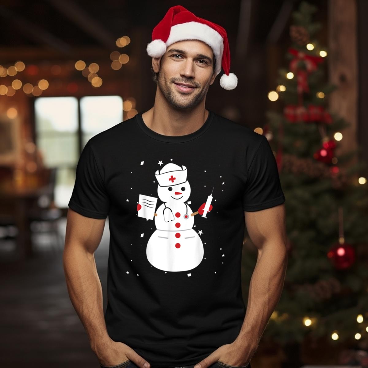 Celebrate the holiday season with our adorable Nurse Snowman Holding Syringe and Clipboard T-shirt! Perfect for healthcare professionals or anyone who appreciates the blend of festive cheer and medical humor, this shirt is ideal for casual outings, themed events, or simply to spread joy during the winter months. Made in the USA, this fan-designed graphic tee combines comfort and style, making it a unique addition to your wardrobe.