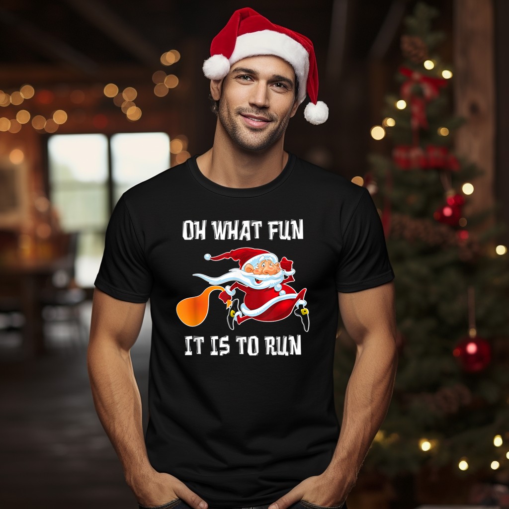 Get ready to spread some holiday cheer with our “Oh What Fun It Is To Run” Santa Christmas Humor T-Shirt! Perfect for anyone who loves to embrace the festive spirit, this shirt is ideal for casual wear, themed events, or just lounging during the holiday season. Made with a fun, fan-made design printed right here in the USA, it’s sure to bring smiles and laughter wherever you go!