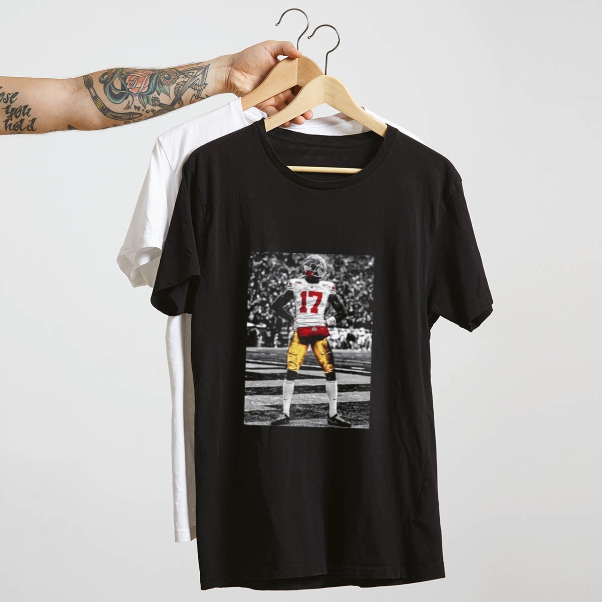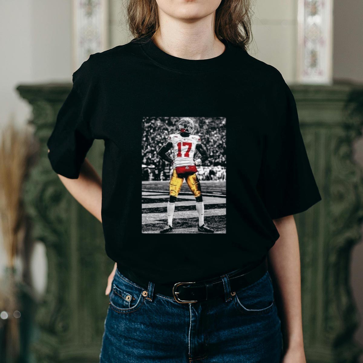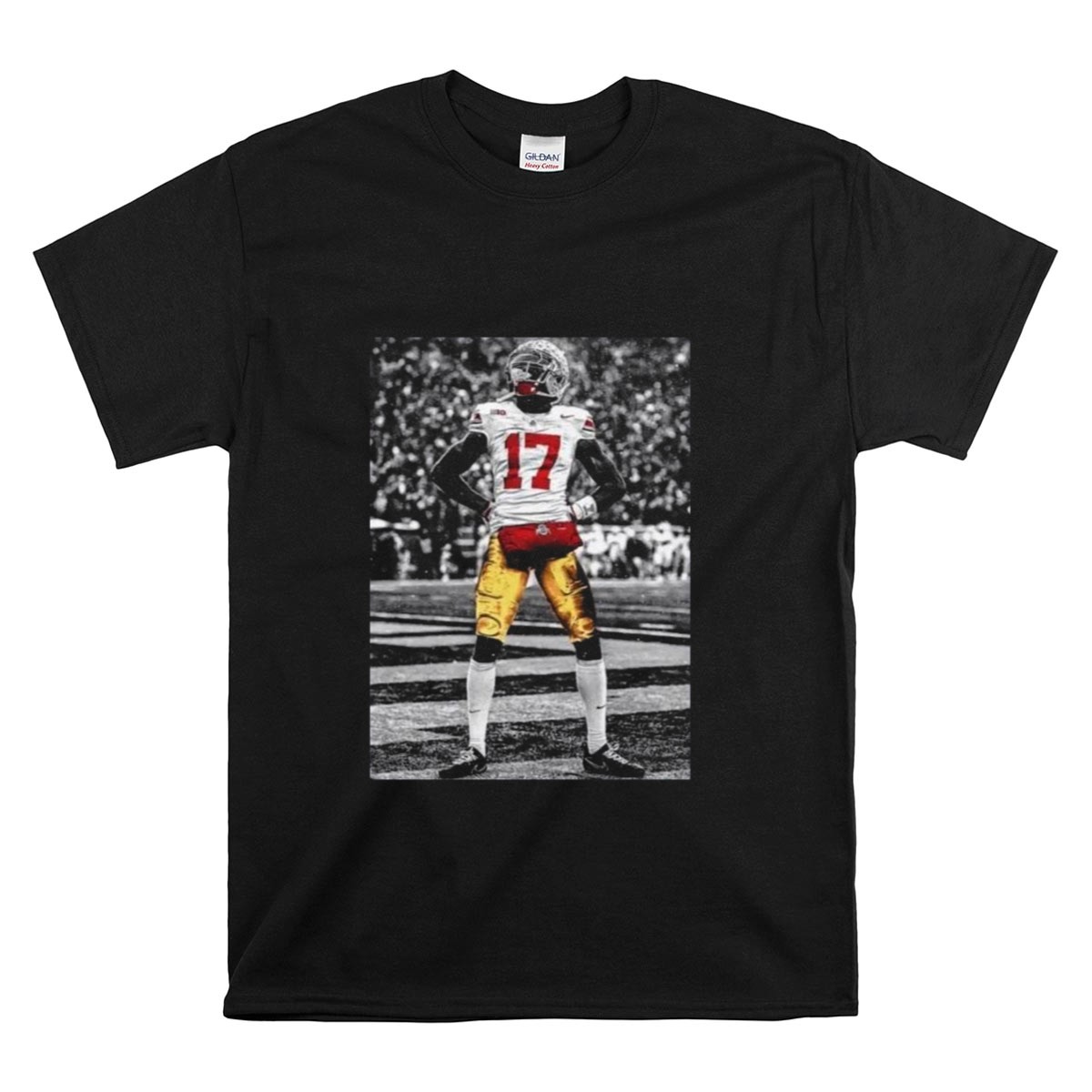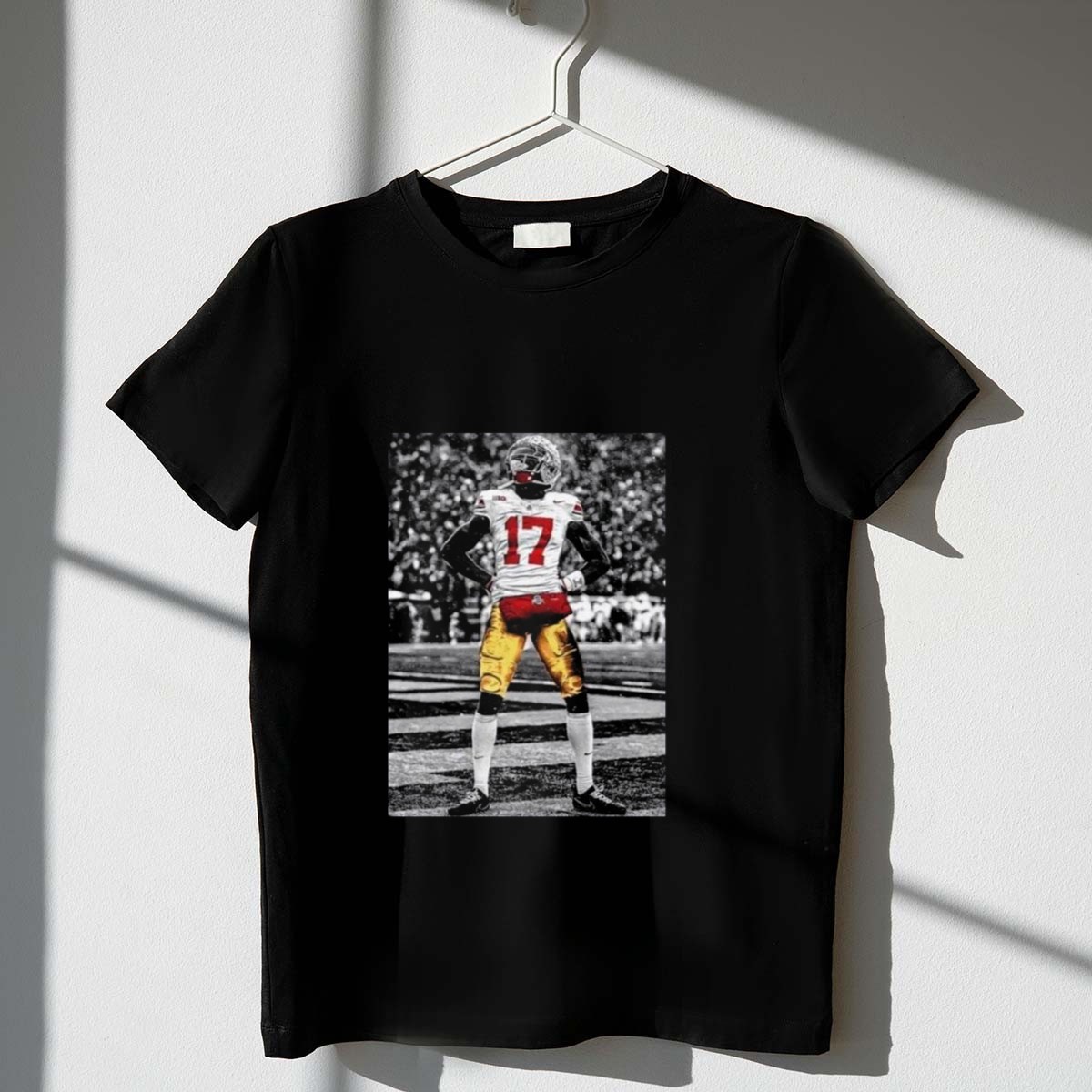 Show your unwavering support for the Ohio State Buckeyes with the Carnell Tate Standing T-Shirt. This fan-made design is perfect for dedicated Buckeyes fans of all ages, making it an ideal choice for casual outings, themed events, or just everyday wear. Proudly printed in the USA, this shirt combines comfort with a striking design that celebrates your favorite player and team.